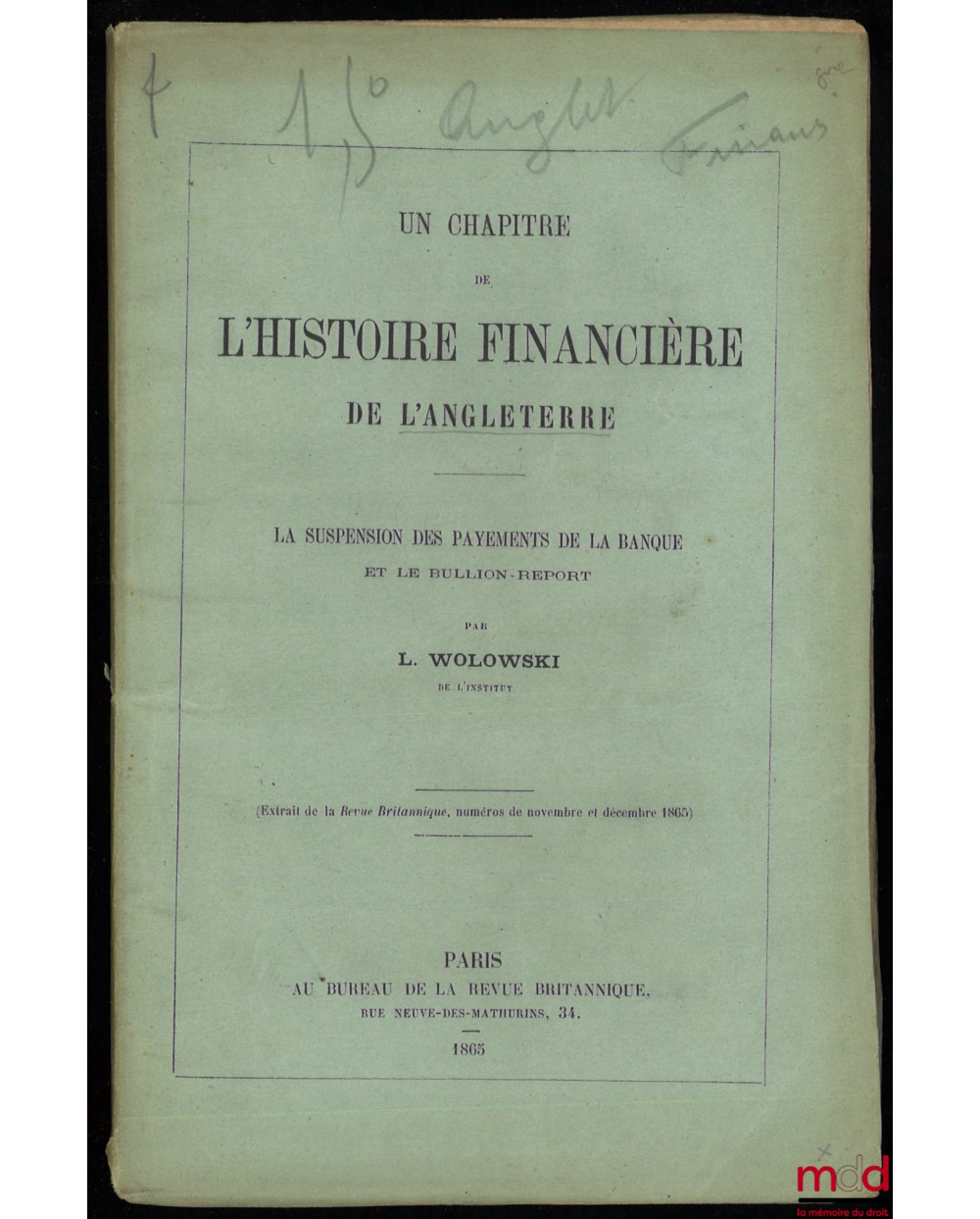 UN CHAPITRE DE L’HISTOIRE FINANCIÈRE DE L’ANGLETERRE, LA SUSPENSION DES PAYEMENTS DE LA BANQUE ET LE BULLION-REPORT, extrait de la Revue Britannique, n° nov. et déc. 1865