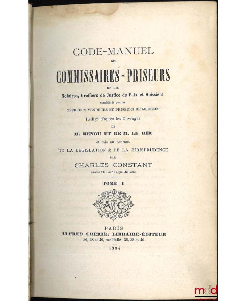 CODE-MANUEL des COMMISSAIRES-PRISEURS et des Notaires, Greffiers de Justice de Paix et Huissiers considérés comme OFFICIERS VENDEURS ET PRISEURS DE MEUBLES. Rédigé d’après les ouvrages de M. BENOU ET DE M. LE HIR et mis au courant DE LA LÉGISLATION & DE LA JURISPRUDENCE
