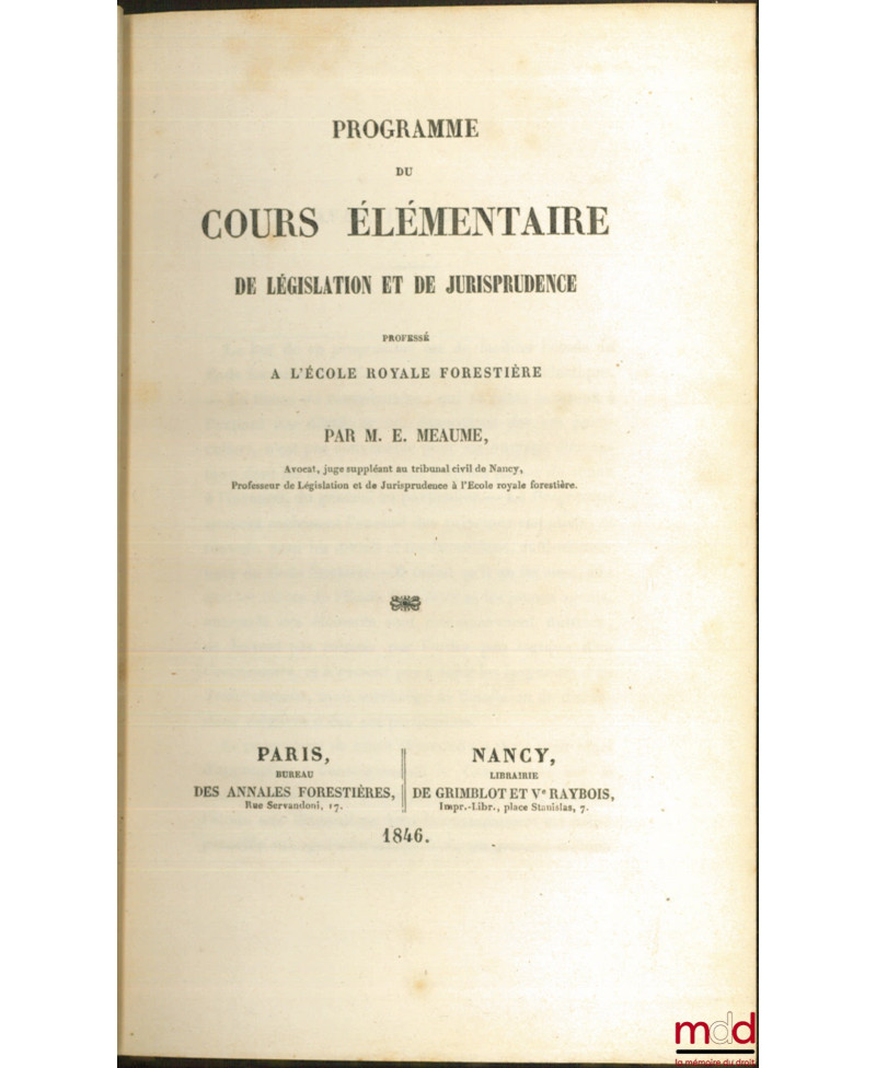 PROGRAMME du COURS ÉLÉMENTAIRE DE LÉGISLATION ET DE JURISPRUDENCE professé À L’ÉCOLE ROYALE FORESTIÈRE