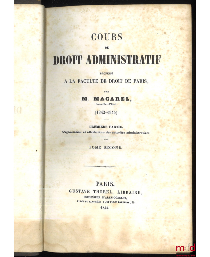 COURS DE DROIT ADMINISTRATIF PROFESSÉ À LA FACULTÉ DE DROIT DE PARIS :Première partie — t. II [uniquement] : Organisation et attribution des autorités administratives