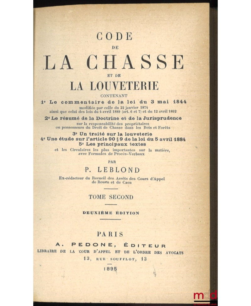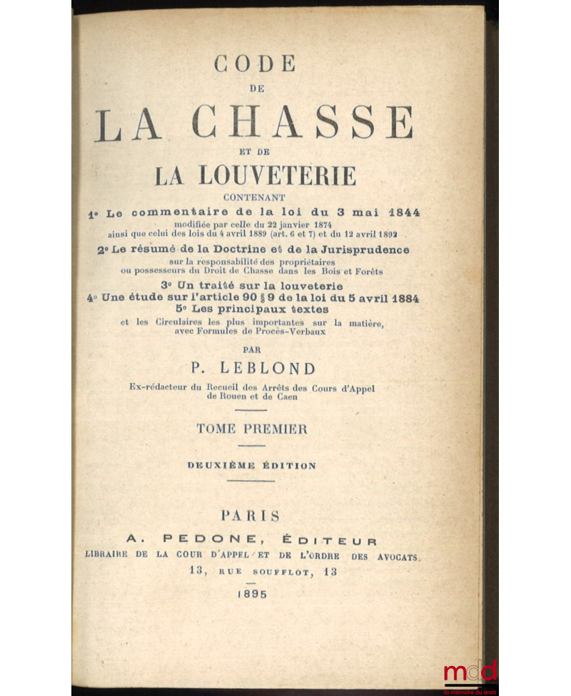 CODE DE LA CHASSE ET DE LA LOUVETERIE CONTENANT1° Le commentaire de la loi du 3 mai 1844 ;2° Le résumé de la Doctrine et de la jurisprudence sur la responsabilité des propriétaires ou possesseurs du Droit de Chasse dans les Bois et Forêts ;3° Un traité sur la louveterie ;4° Une étude sur l’article 90 § 9 de la loi du 5 avril 1884 ;5° Les principaux textes et les Circulaires les plus importantes sur la matière, avec Formules et Procès-Verbaux, 2e éd.