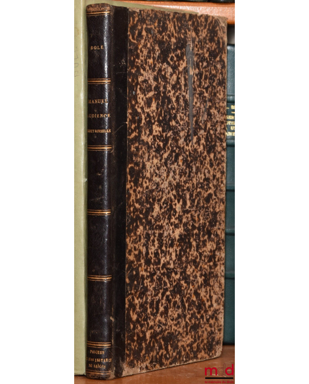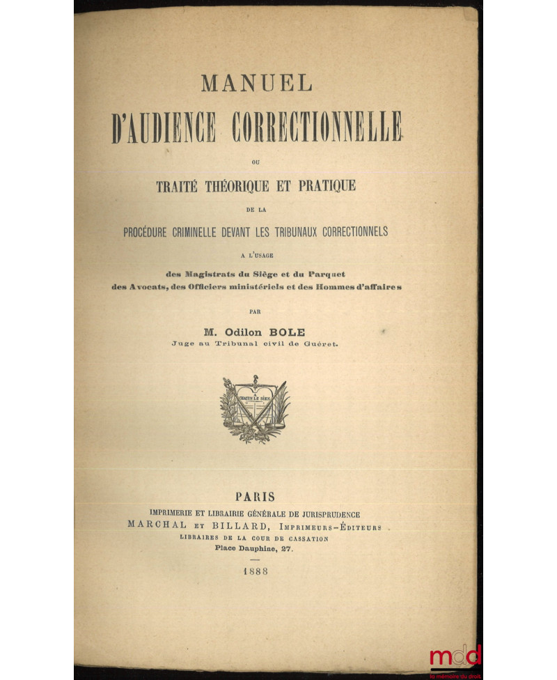 MANUEL D’AUDIENCE CORRECTIONNELLE OU TRAITÉ THÉORIQUE ET PRATIQUE DE LA PROCÉDURE CRIMINELLE DEVANT LES TRIBUNAUX CORRECTIONNELS, à l’usage des Magistrats du Siège et du Parquet, des Avocats, des Officiers ministériels et des Hommes d’affaires