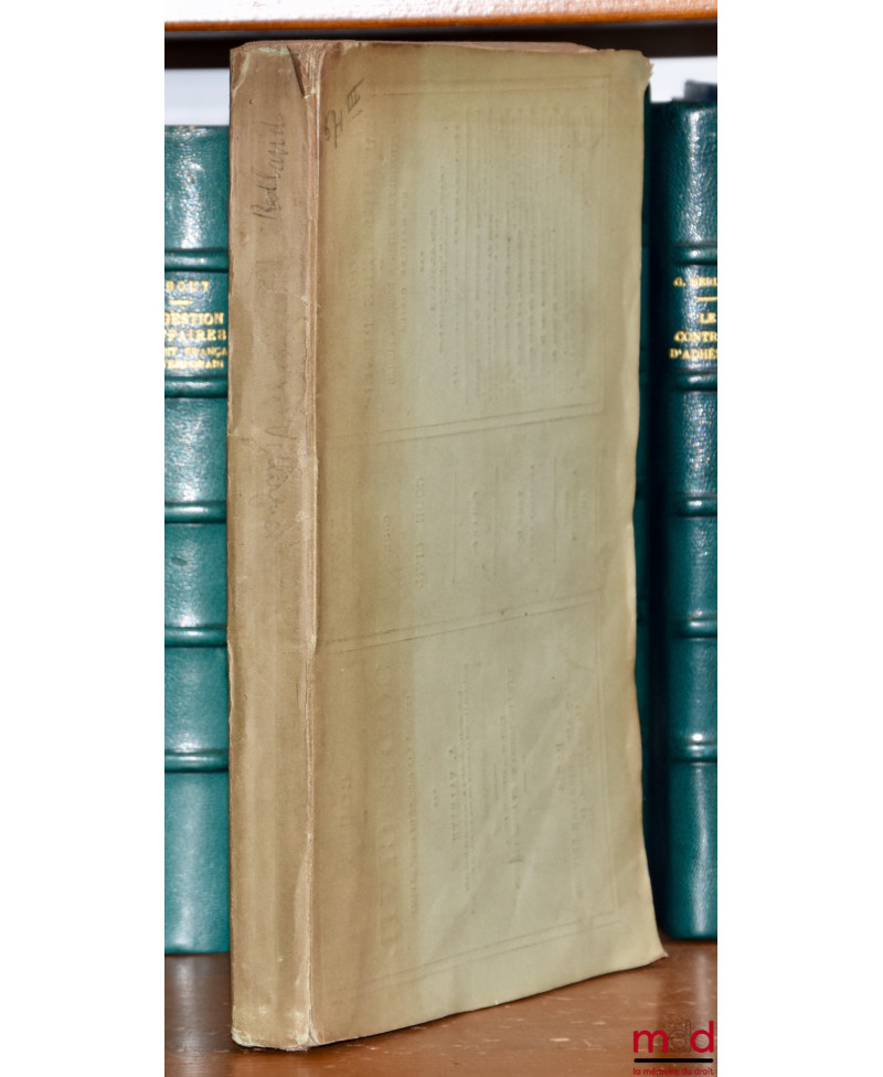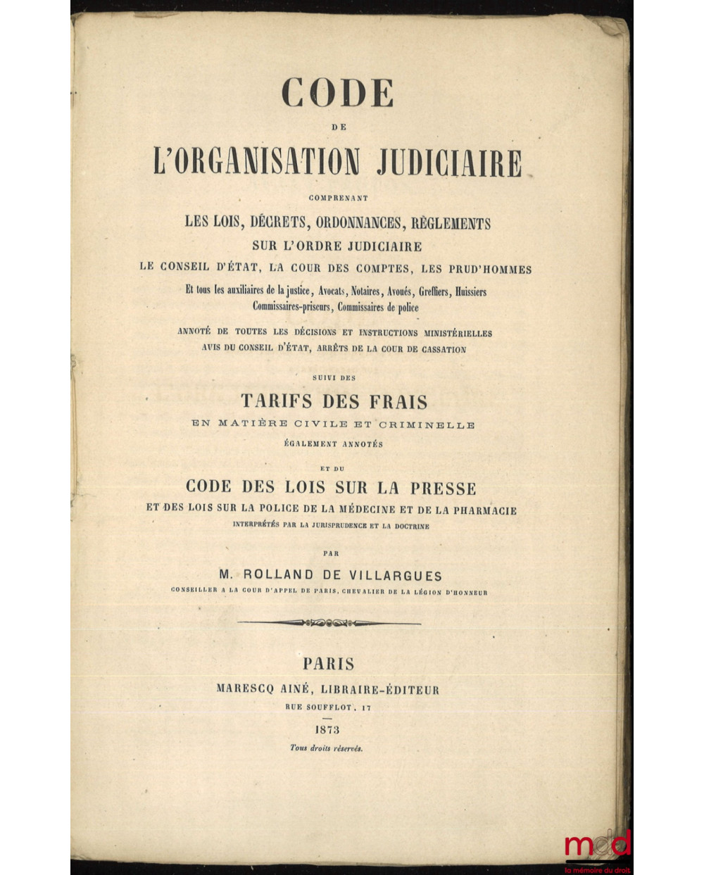 CODE DE L’ORGANISATION JUDICIAIRE COMPRENANT LES LOIS, DÉCRETS, ORDONNANCES, RÈGLEMENTS SUR L’ORDRE JUDICIAIRE. LE CONSEIL D’ÉTAT, LA COUR DES COMPTES, LES PRUD’HOMMES et tous les auxiliaires de la justice, Avocats, Notaires, Avoués, Greffiers, Huissiers, Commissaires-priseurs, Commissaire de police, annoté de toutes les décisions et instructions ministérielles, avis du Conseil d’État, arrêts de la Cour de cassation, contenant les tarifs des frais en matières civile et criminelle également annotés et du Code des lois sur la presse et des lois sur le police de la médecine et de la pharmacie interprétés par la jurisprudence et la doctrine