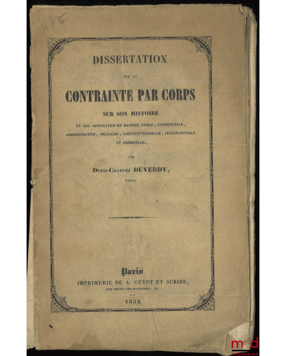 DISSERTATION SUR LA CONTRAINTE PAR CORPS, SUR SON HISTOIRE ET SON APPLICATION EN MATIÈRE CIVILE, COMMERCIALE, ADMINISTRATIVE, MILITAIRE, CONSTITUTIONNELLE, INTERNATIONALE ET CRIMINELLE