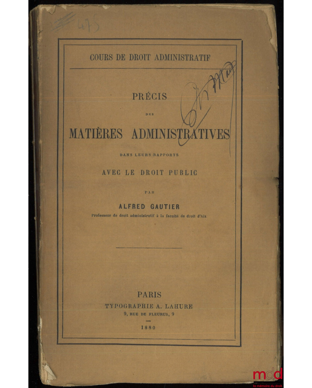 Cours de droit administratif : PRÉCIS DES MATIÈRES ADMINISTRATIVES DANS LEURS RAPPORTS AVEC LES MATIÈRES CIVILES ET JUDICIAIRES