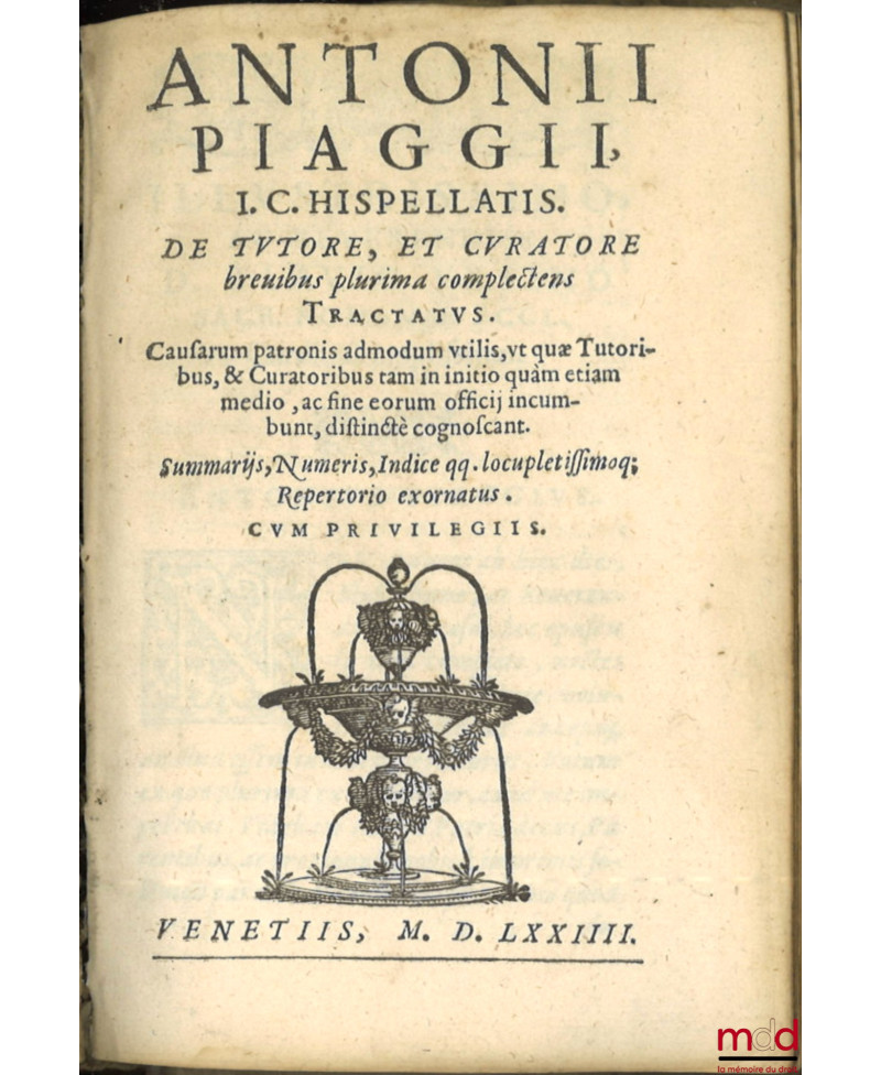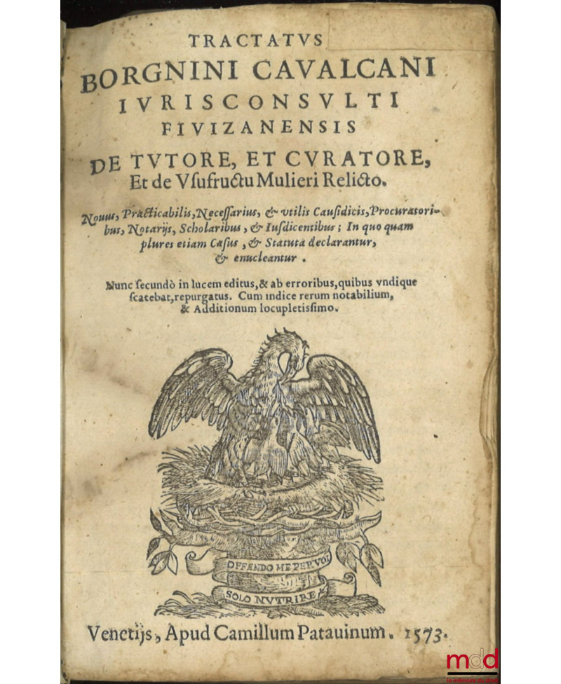 TRACTATUS BORGNINI CAVALCANI IURISCONSULTI FIVIZANENSIS, DE TUTORE, ET CURATORE, Et de Usufructu Mulieri Relicto. Nouus, Practicabilis, Necessarius, & vtilis Causidicis, Procuratoribus, Notarijs, Scholaribus, & Iusdicentibus ; In quo quam plures etiam Cafus, & Statuta declarantur, & enucleantur. Nunc fecundò in lucem editus, & ab erroribus, quibus vndique scatebat, repurgatus. Cum indice rerum notabilium, & Additionum locupletissimo.ANTONII PIAGII, I. C. HISPELLATIS, DE TUTORE, ET CURATORE breuibus plurima complectens TRACTATUS. Causarum patronis admodum utilis, vt quæ Tutoribus, & Curatoribus tam in initio quam etiam medio, ac fine eorum officij incumbunt, distinctè cognoscant. Summarijs, Numeris, Indice qq. locupletissimoq ; Repertorio exornatus. CUM PRIVILEGIIS