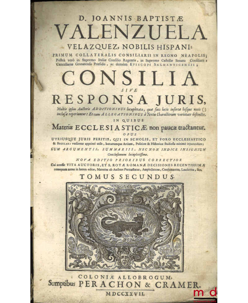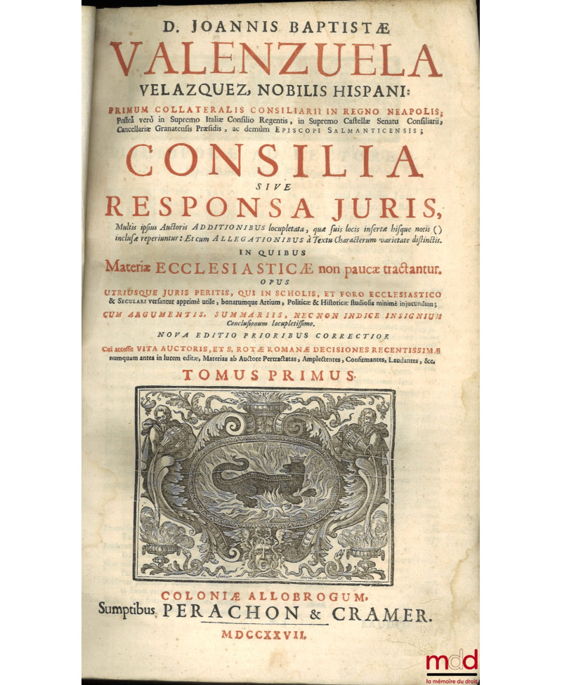 D. JOANNIS BAPTISTÆ VALENZUELA VELAZQUEZ, NOBILIS HISPANI : PRIMUM COLLATERALIS CONSILIARII IN REGNO NEAPOLIS ; Posteà verò in Supremo Italiæ Consilio Regentis, In Supremo Castellæ Senatu Consiliarii, Cancellariæ Granatensis Præsidis, ac demùm EPISCOPI SALMANTICENSIS ; CONSILIA SIVE RESPONSA JURIS, Multis ipsius Auctoris ADDITIONIBUS locupletata, quæ suis locis insertæ hisque notis ( ) inclusæ reperiuntur : Et cum ALLEGATIONIBUS à Textu Characterum varietate distinctis. IN QUIBUS Materiæ ECCLESIASTICÆ non paucæ tractantur. OPUS UTRIUSQUE JURIS PERITIS, QUI IN SCHOLIS, ET FORO ECCLESIASTICO & SECULARI versantur apprimè utile, bonarumque Artium, Politicæ & Historicæ studiodis minimè injucundum ; CUM ARGUMENTIS, SUMMARIIS. NEC NON INDICE INSIGNIUM Conclusionum locupletissimo. NOVA EDITIO PRIORIBUS CORRECTIOR, Cui accessit VITA AUCTORIS, ET S. ROTÆ ROMANÆ DECISIONES RECENTISSIMÆ numquam antea in lucem editæ, Materias ab Auctore Pertractatas, Amplectentes, Confirmantes, Laudantes, &c