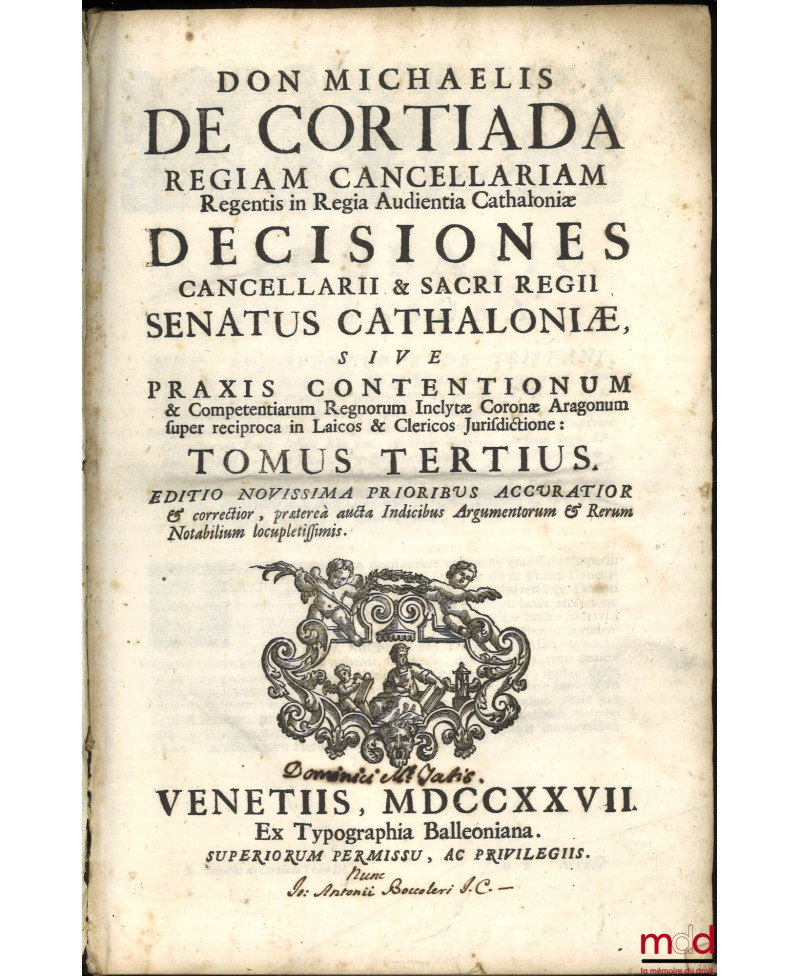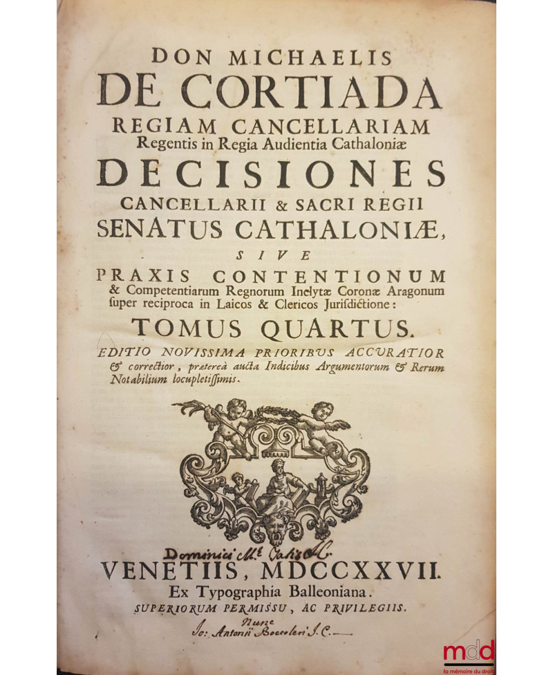 DON MICHAELIS DE CORTIADA REGIAM CANCELLARIAM Regentis in Regia Audientia Cathaloniæ, DECISIONES CANCELLARII & SACRI REGII SENATUS CATHALONIÆ, Sive Praxis Contentionum & Competentiarum Regnorum Inclytæ Coronæ Aragonum super reciproca in Laicos & Clericos Jurisdictione, Tomus tertius [&] quatrus, Editio novissima prioribus accuratior & correctior, prætereà aucta Indicibus Argumentorum & Rerum Notabilium locupletissimis, [mq. les t. I et II]
