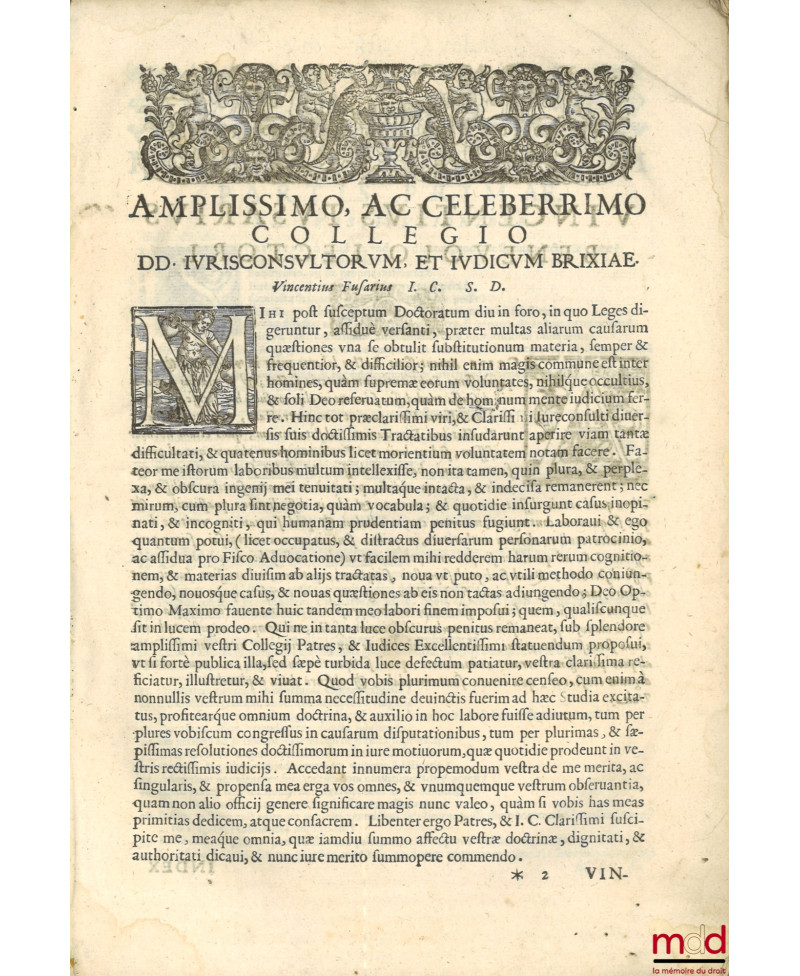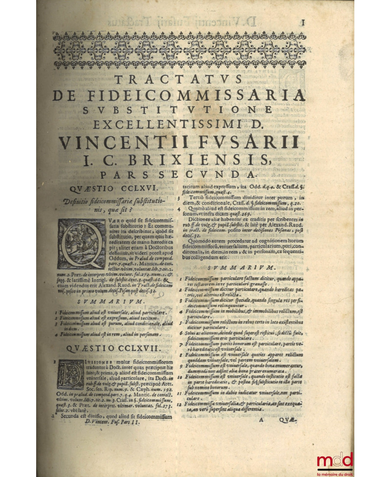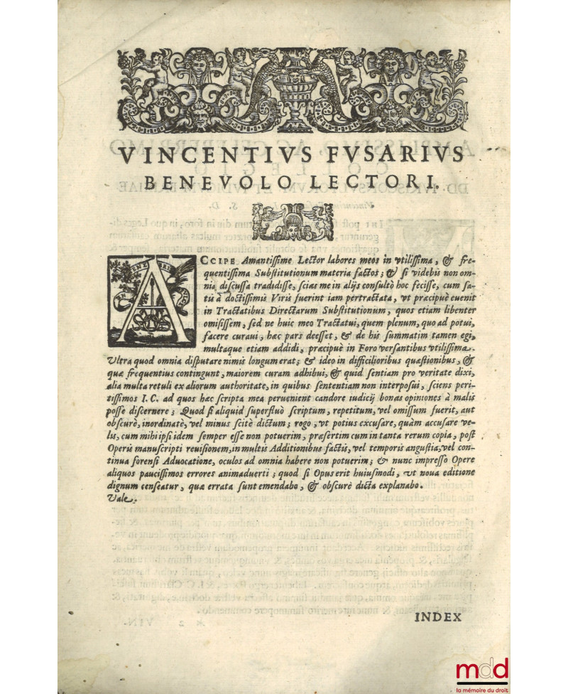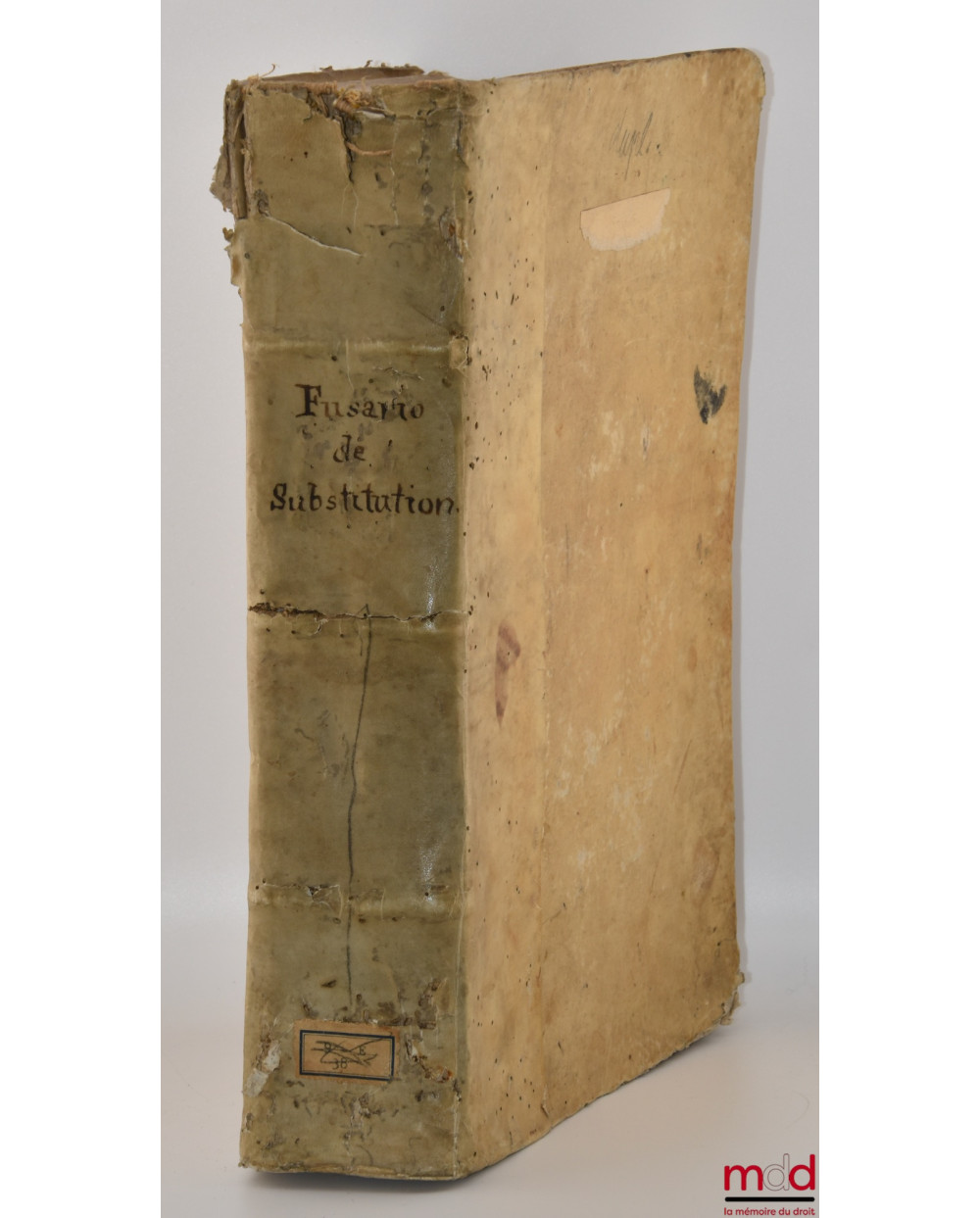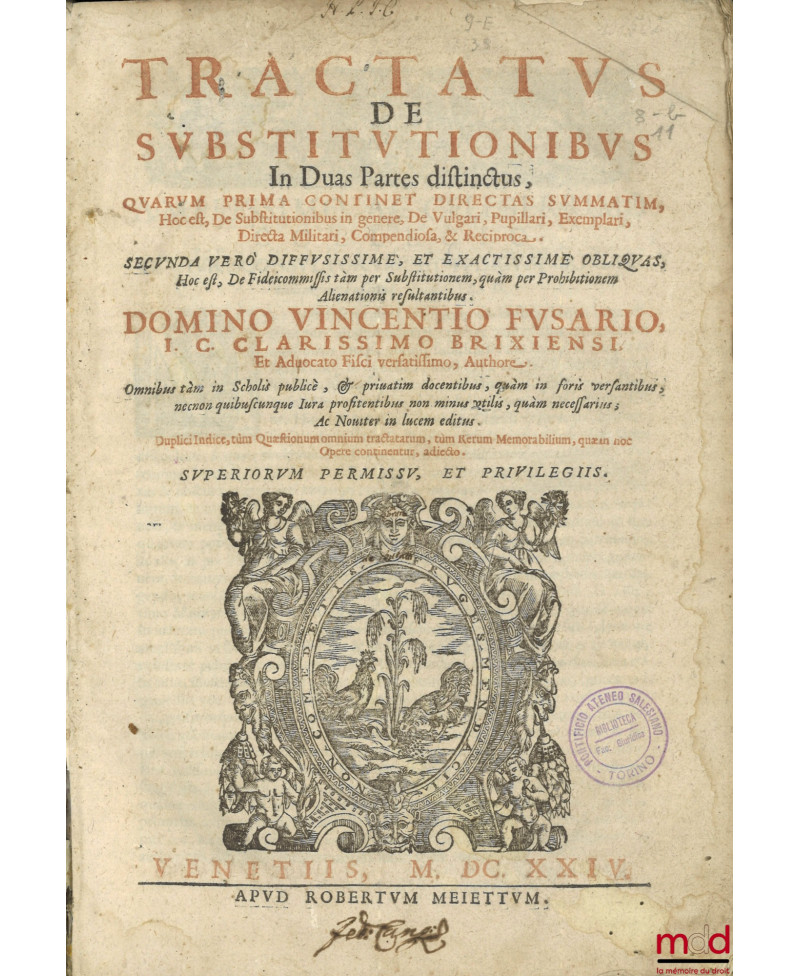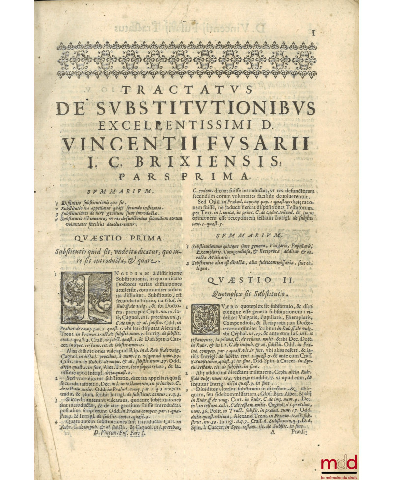 Tractatus de substitutionibus In Duas Partes distinctus, quarum prima continet directa summatim, Hoc est, De Substitutionibus in genere, De Vulgari, Pupillari, Exemplari, Directa Militari, Compendiosa, & Reciproca. Secunda vero diffusissime, et exactissime obliquas, Hoc est, De Fideicommissis tàm per Substitutionem, quàm per Prohibitionem Alienationis resultantibus. Domino Vincentio Fusario, I. C. clarissimo Brixiensi, Et Aduocato Fisci versatissimo, Authore. Omnibus tàm in Scholis publicè, & privatim docentibus, quàm in foris versantibus, necnon quibuscunque Iura profitentibus non minus utilis, quàm necessarius ; Ac Nouiter in lucem editus. Duplici Indice, tùm Quæstionum omnium tractatarum, tùm Rerum Memorabilium, quæ in noc Opere continentur, adiecto.