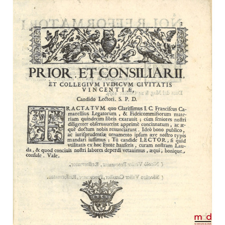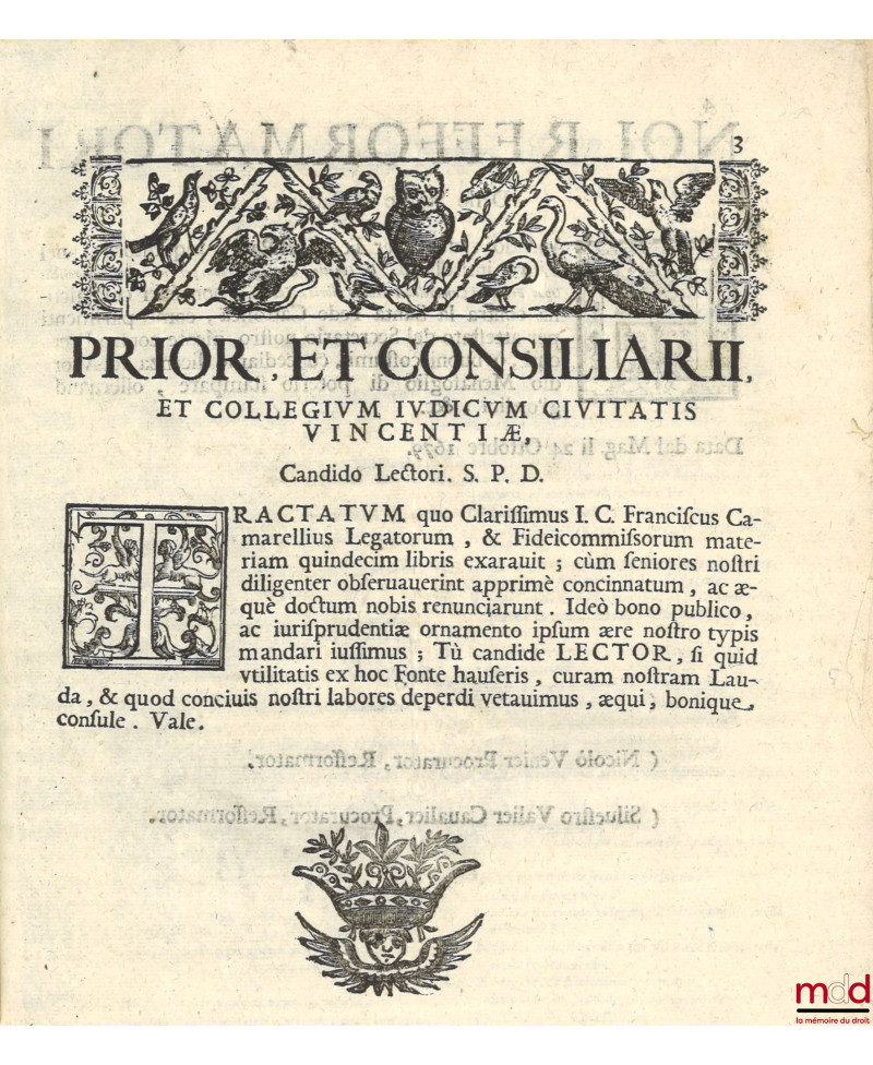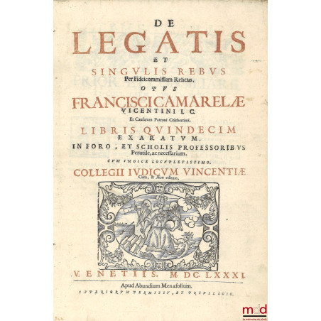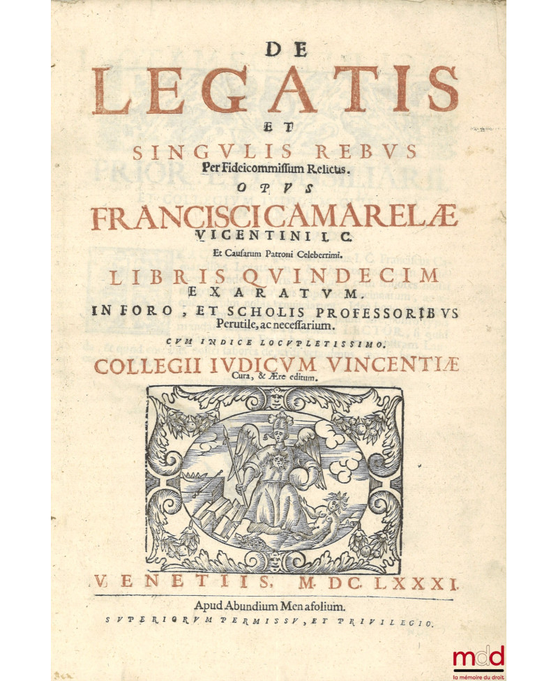 DE LEGATIS ET SINGULIS REBUS PER FIDEICOMMISSUM RELICTIS, Libris quindecim exaratum, in foro ; et scholis professoribus Perutile, ac necessarium. Cum indice locupletissim. Collegii judicum Vincentiae Cura et Ære editum.