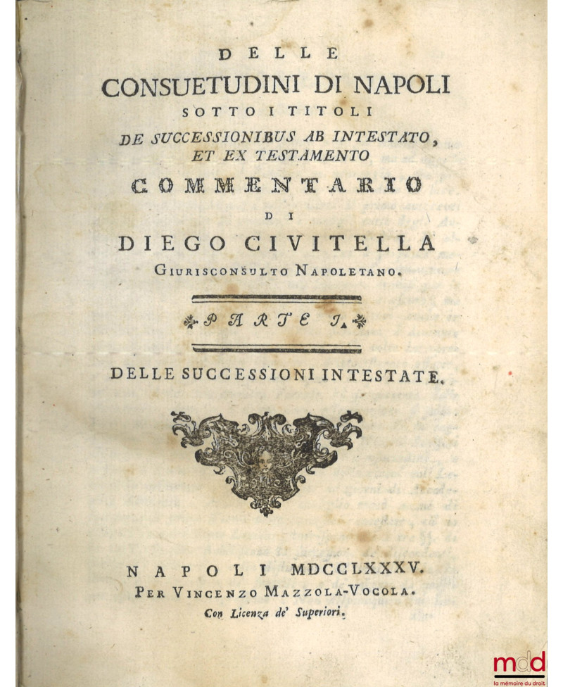 Delle Consuetudini di Napoli sotto i titoli De successionibus ab intestato, et ex testamento commentario, Parte I : Delle successioni intestate.