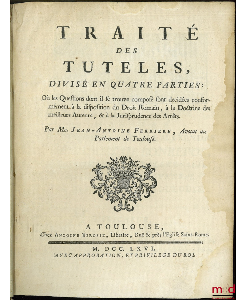TRAITÉ DES TUTELLES, divisé en quatre parties : Où les questions dont il se trouve composé sont décidées conformément à la disposition du Droit Romain, à la Doctrine des meilleurs auteurs, & à la Jurisprudence des Arrêts