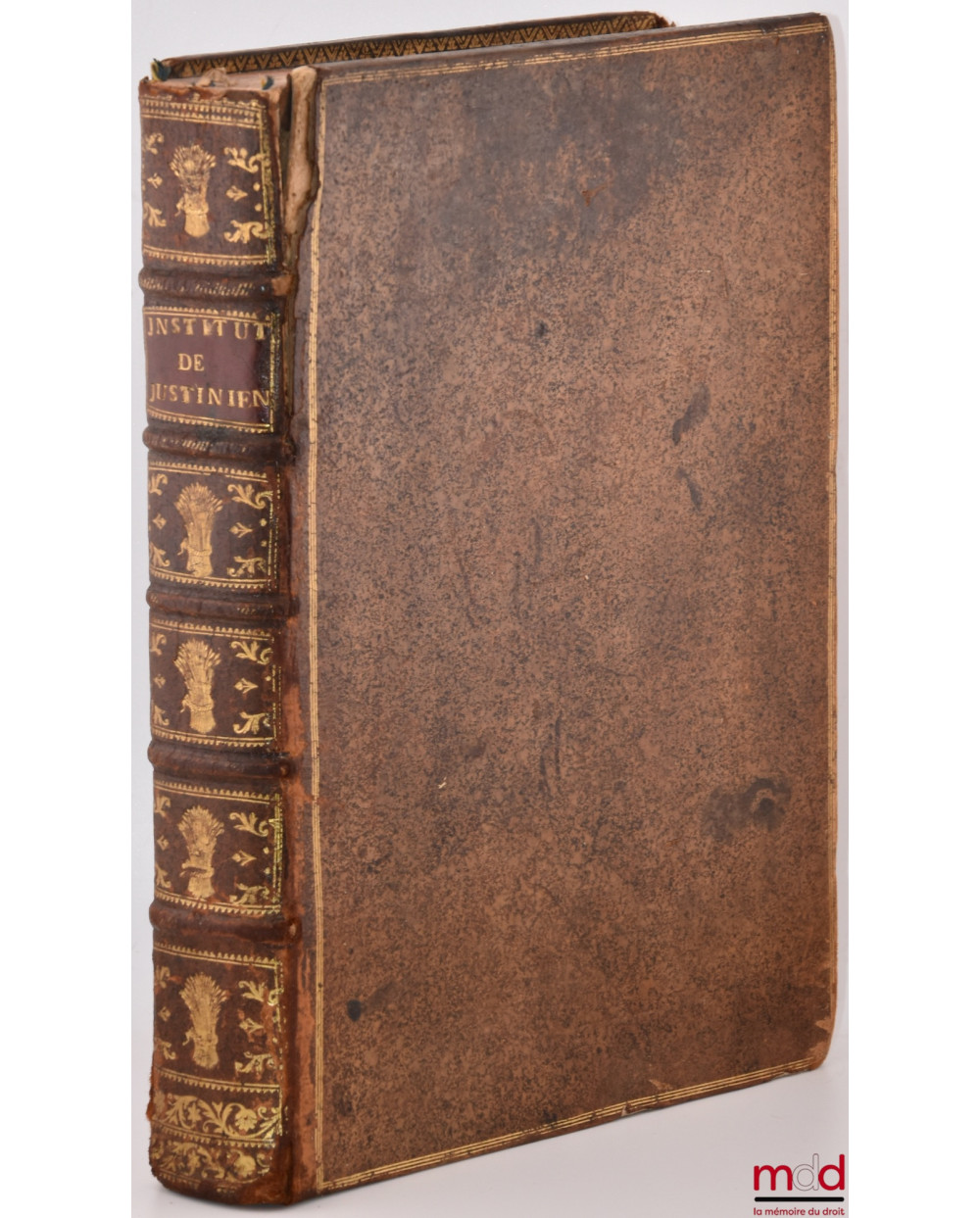 Description : in-4, plein veau moucheté d’époque, dos à 5 nerfs richement orné de frises, filets, dentelles et motifs champêtres et floraux dorés, tit. doré sur pc. de maroquin bordeaux encadrée d’un filet et d’une dentelle doré, plats encadrés d’un triple filet doré, double filet doré sur les coupes, contre-plats ornés d’une frise dorée, tr. jaspées rouges, bandeaux, vignettes, lettrines et culs-de-lampe, Ex-libris en timbre sec « Pierre Marmoiton avocat », (mors partiel fendus avec un mq. de cuir sur le plat sup., coiffe sup. manquante, rel. légt usée avec qq. épidermures, coins émoussés, auréoles sur le haut des pages, qq. annotations à l’encre en marge), XVI-655 p.