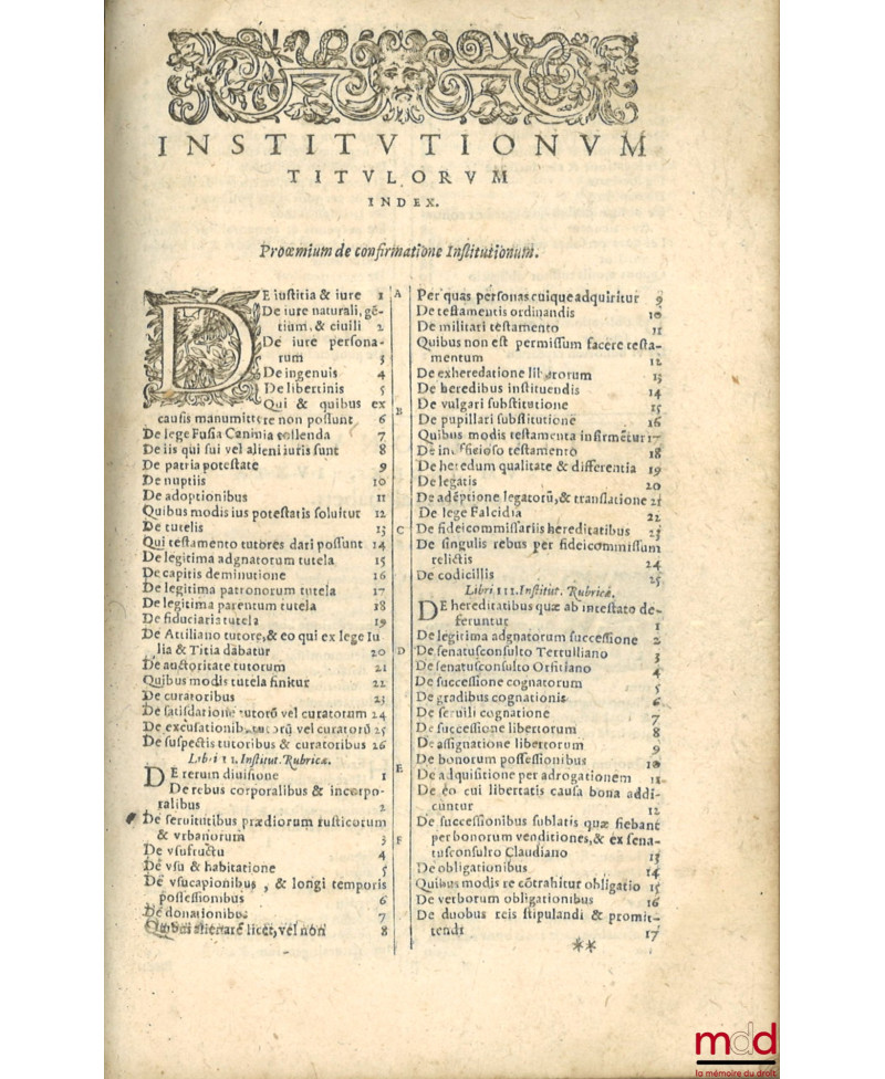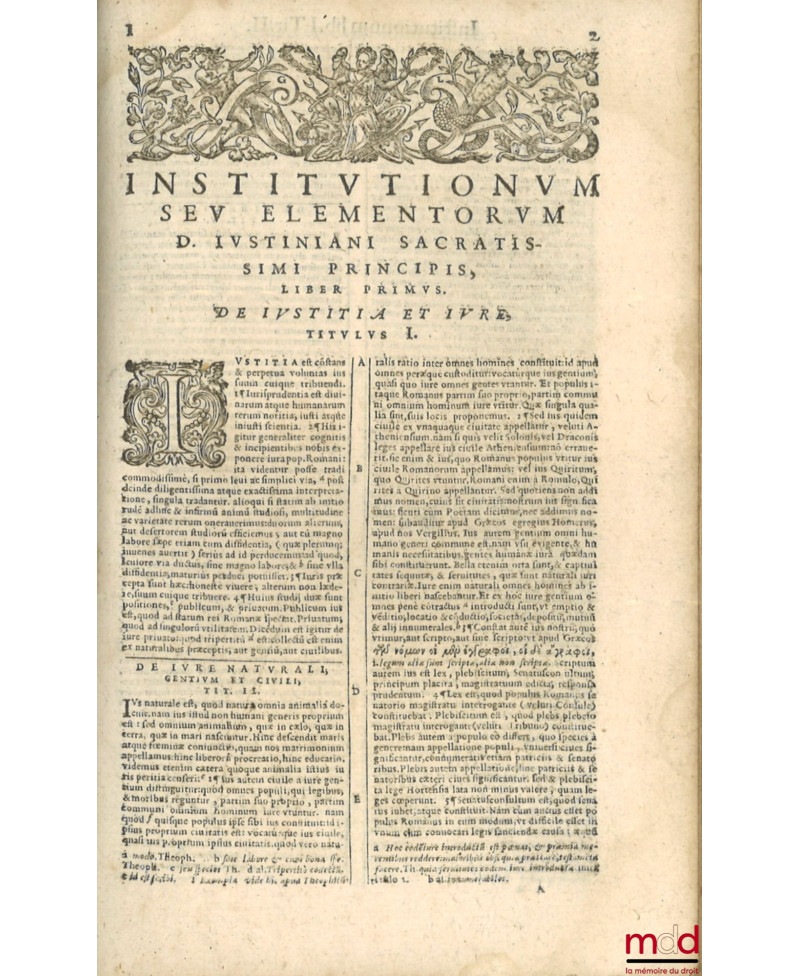 Réunion des œuvres les plus importantes du droit romain, le Corpus Juris Civilis et le Codicis Justiniani avec les commentaires, considérés aujourd’hui encore, comme les meilleurs par Denis Godefroy.