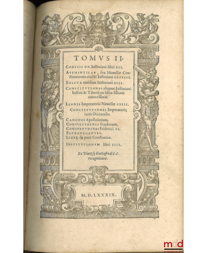 CORPUS JURIS CIVILIS, In quo, vice interpretationis, variæ lectiones, si non omnes, præcipuæ tamen & magisnecessarie adiectæ. Tomus I. Pandectarum seu DIGESTORUM libri quinquaginta. Additus est breuiculus index M. CCCC. XXV. Regulas iuris continens. Tomus II. Codicis DN.Iustiniani libri XII. Authenticae, seu Nouellæ Constitutiones eiusde Iustiniani CLXVIII. Edicta eiusdem Iustiniani XIII. Constitutiones aliquot Iustiniani Iustini & Tiberii ex libro Iuliani antecessoris. Leonis Imperatoris Nouellæ CXIII. Constitutiones Imperatorie iuris Orientalis. Canones Apostolorum. Consuetudines Feudorum. Consuetudines Friderici II. Extravagantes. Liber de pace Constantiæ. Institutionum libri IIII.