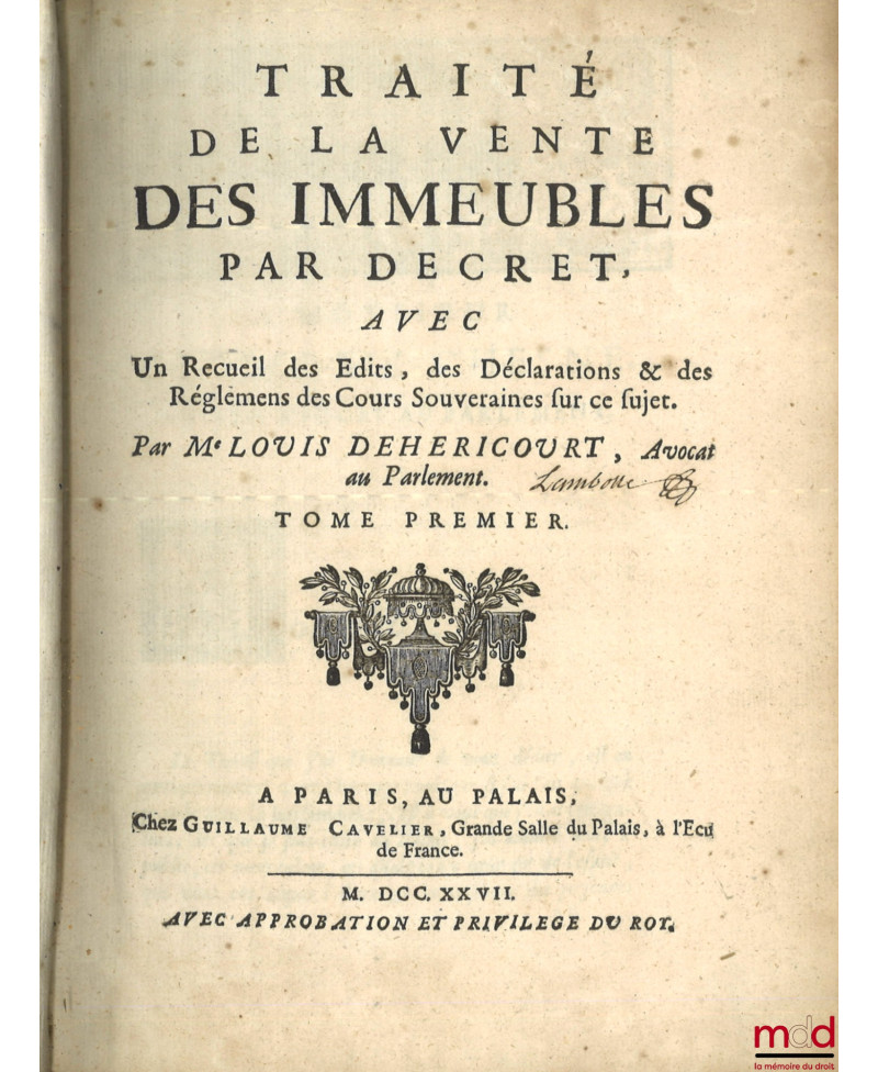 TRAITÉ DE LA VENTE DES IMMEUBLES PAR DÉCRET, Avec un recueil des Édits, des Déclarations & des Règlemens des Cours Souveraines sur ce sujet