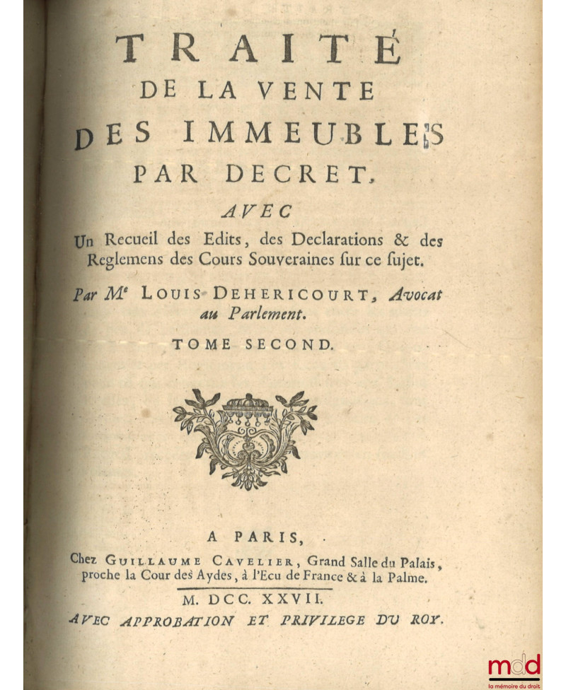 (Dupin, réf. 1700). On entendait par ventes par décret dans l’ancien droit les ventes des biens saisis. Le traité constitue dans cette matière certainement la meilleure œuvre du XVIIIe siècle. L’auteur ne se borne pas à énoncer la procédure mise en œuvre de ces ventes, mais étend son propos à l’ensemble des voies d’exécution en cours à cette époque. Il développe notamment une théorie générale des saisies réelles et un traité général de l’hypothèque absolument remarquable. A tous égards un ouvrage de référence.
