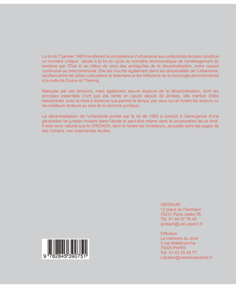 La loi du 7 janvier 1983 transférant la compétence d'urbanisme aux collectivités locales constitue un moment critique : située à la fin du cycle du triomphe technocratique de l'aménagement du territoire par l’État et au début de celui des ambiguïtés de la décentralisation, entre ressort communal ou intercommunal. Elle est inscrite également dans les temporalités de l'urbanisme, oscillant entre les pôles corbuséens et lefevriens et les réflexions de la sociologie administratives à la suite de Dupuy et Thoenig. Marquée par ces tensions, mais également œuvre majeure de la décentralisation, dont les principes essentiels n'ont pas été remis en cause depuis 40 années, elle méritait d'être réexaminée, avec la mise à distance que permet le temps, par ceux qui en furent les acteurs ou les meilleurs lecteurs au sein de la doctrine juridique. La décentralisation de l'urbanisme portée par la loi de 1983 a conduit à l’émergence d'une génération de juristes investis dans l'étude et peut-être même dans la structuration de ce droit. Il était donc naturel que le GRIDAUH, dont ils furent les fondateurs, accueille dans les pages de ses Cahiers, ces importantes études.