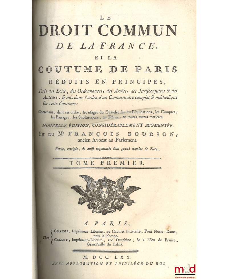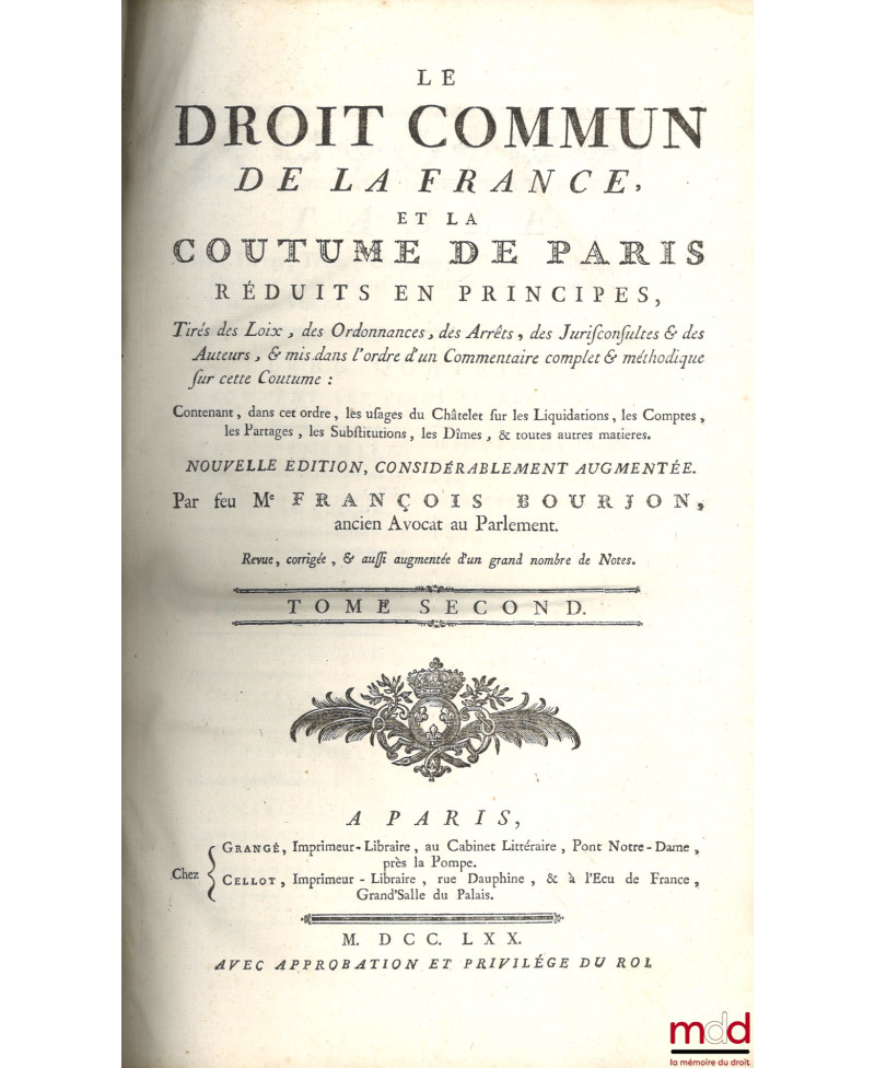 LE DROIT COMMUN DE LA FRANCE, ET LA COUTUME DE PARIS RÉDUITS EN PRINCIPES, tirés des Loix, des Ordonnances, des Arrêts, des Jurisconsultes & des Auteurs, & mis dans l’ordre d’un Commentaire complet & méthodique sur cette Coutume : Contenant, dans cet ordre, les usages du Châtelet sur les Liquidations, les Comptes, les Partages, les Substitutions, les Dîmes, & toutes autres matières. Nouvelle édition, considérablement augmentée. Revue, corrigée, & augmentée d’un grand nombre de Notes.