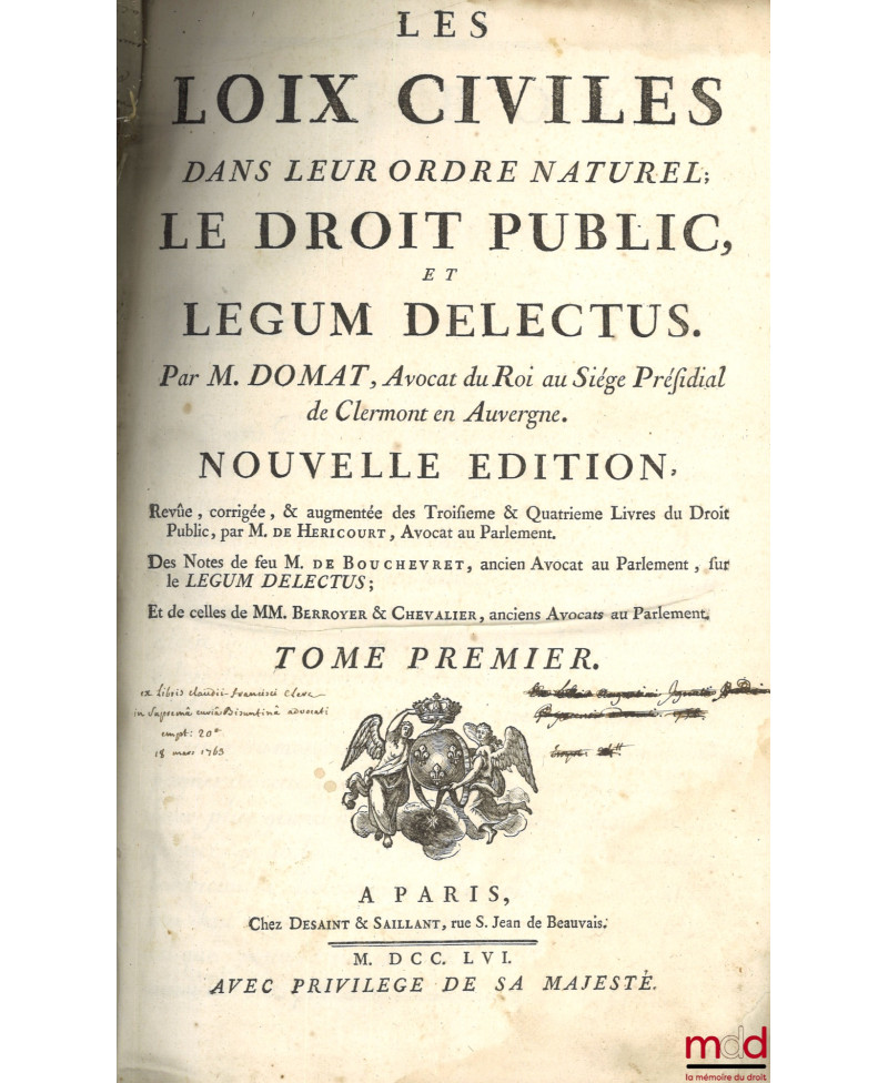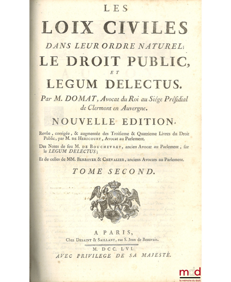 LES LOIX CIVILES DANS LEUR ORDRE NATUREL, LE DROIT PUBLIC, ET LEGUM DELECTUS, Nouvelle éd. revûe, corrigée, & augmentée des Troisième & Quatrième Livres du Droit Public, par M. De Hericourt, Avocat au Parlement ; Des Notes de feu M. De Bouchevret, ancien Avocat au Parlement, sur le Legum Delectus ; et de celles de MM. Berroyer et Chevalier, anciens Avocats au Parlement
