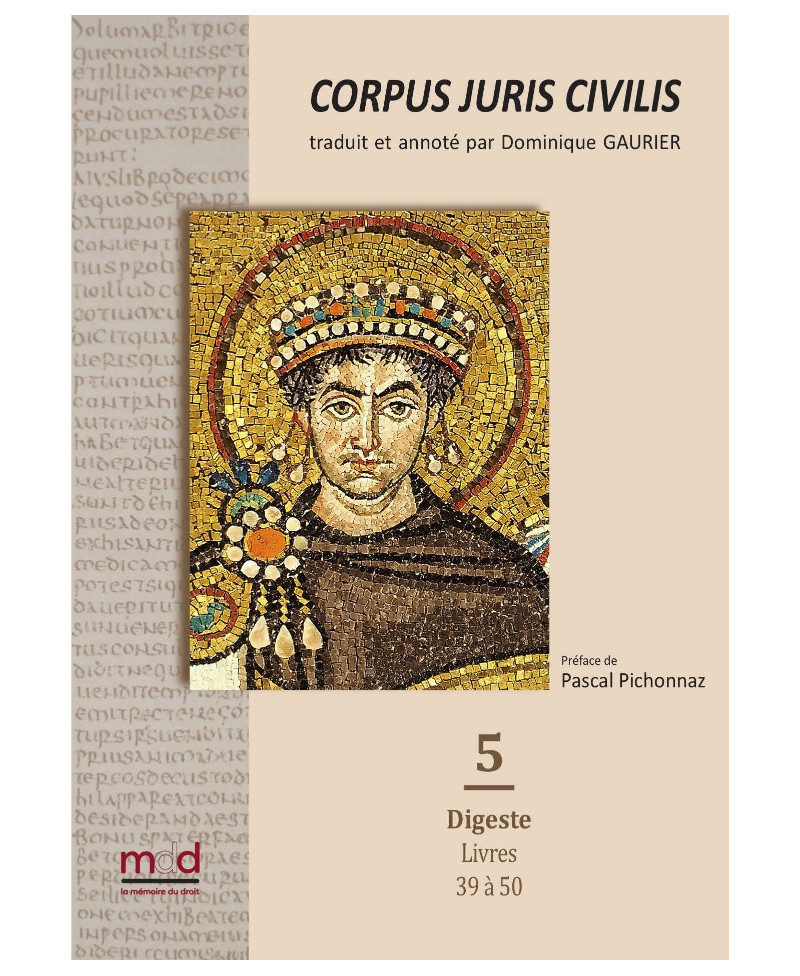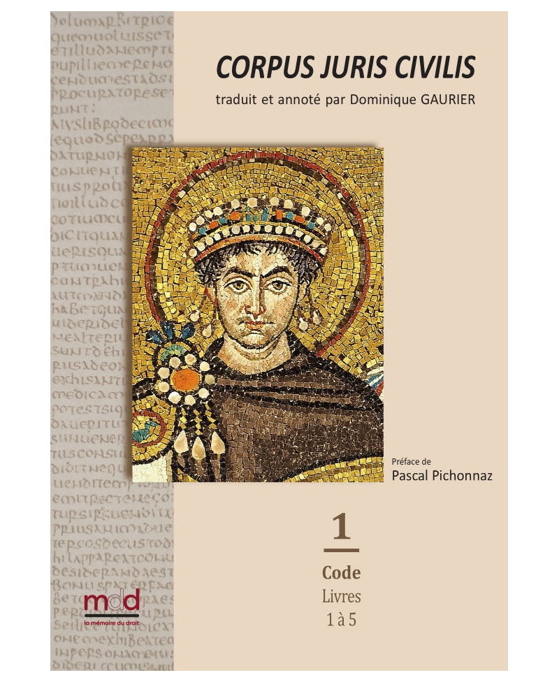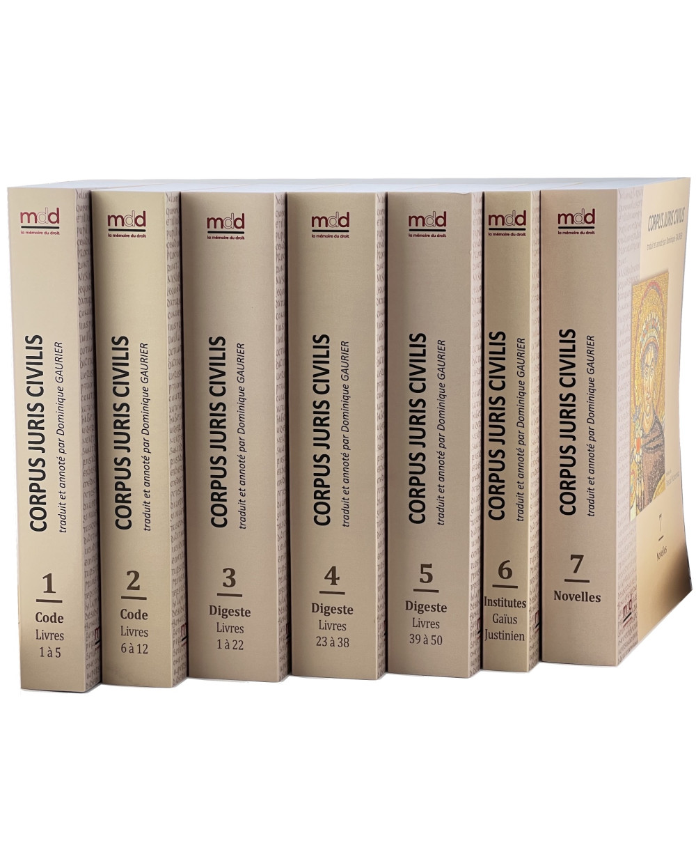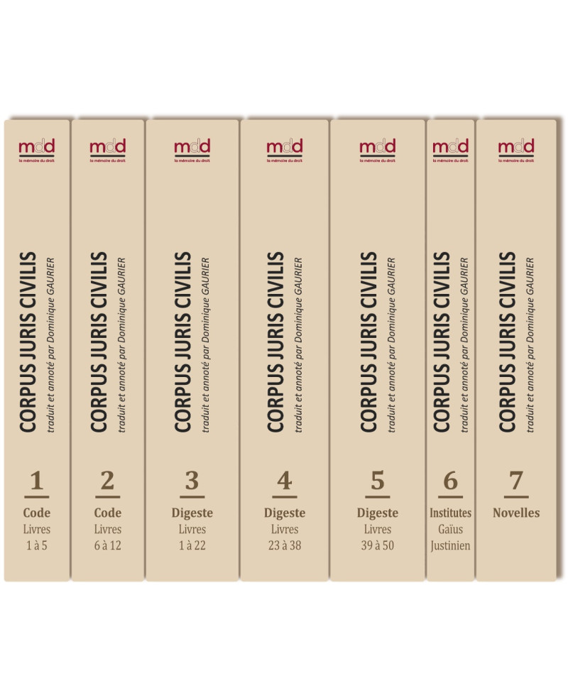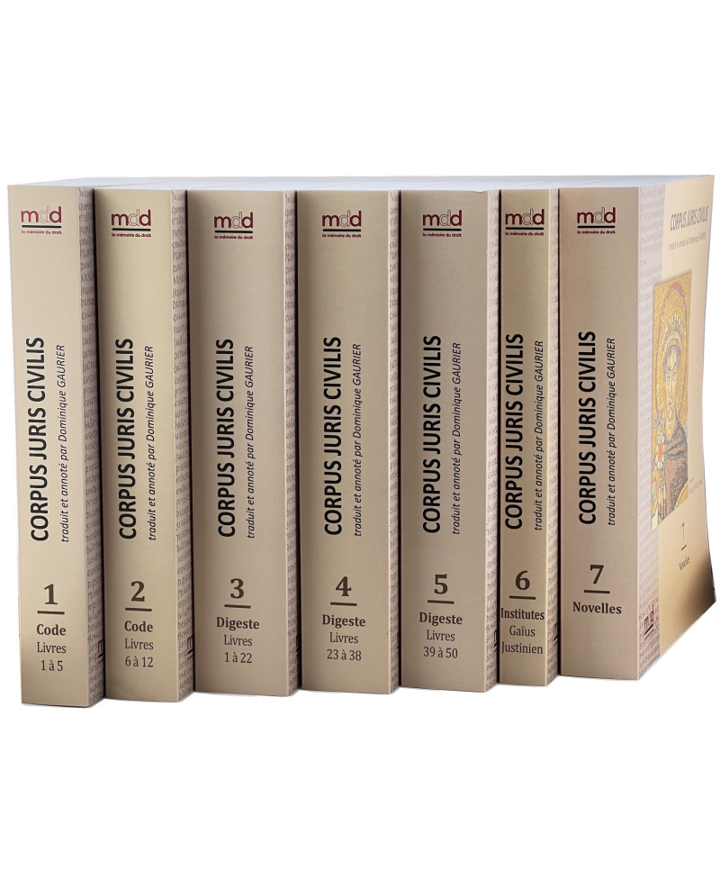 CORPUS JURIS CIVILIS, traduit et annoté par Dominique GAURIER, Préfaces de Pascal Pichonnaz, Tome 1 : Code, Livres 1 à 5 (650 p.) ;Tome 2 : Code, Livres 6 à 12 (720 p.) ;Tome 3 : Digeste, Livres 1 à 22, 2e éd. (912 p.) ;Tome 4 : Digeste, Livres 23 à 38, 2e éd. (870 p.) ;Tome 5 : Digeste, Livres 39 à 50, 2e éd. (844 p.) ;Tome 6 : Institutes de Gaïus et Justinien (468 p.) ;Tome 7 : Novelles (794 p.)