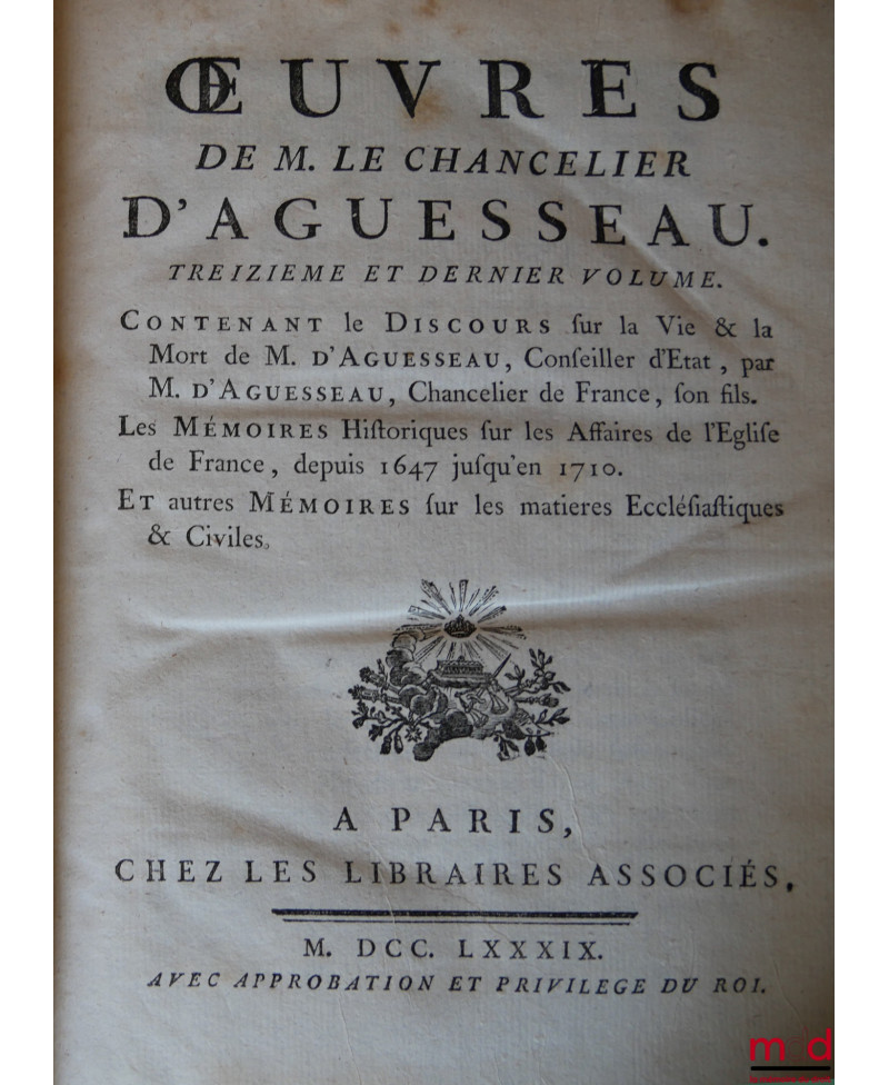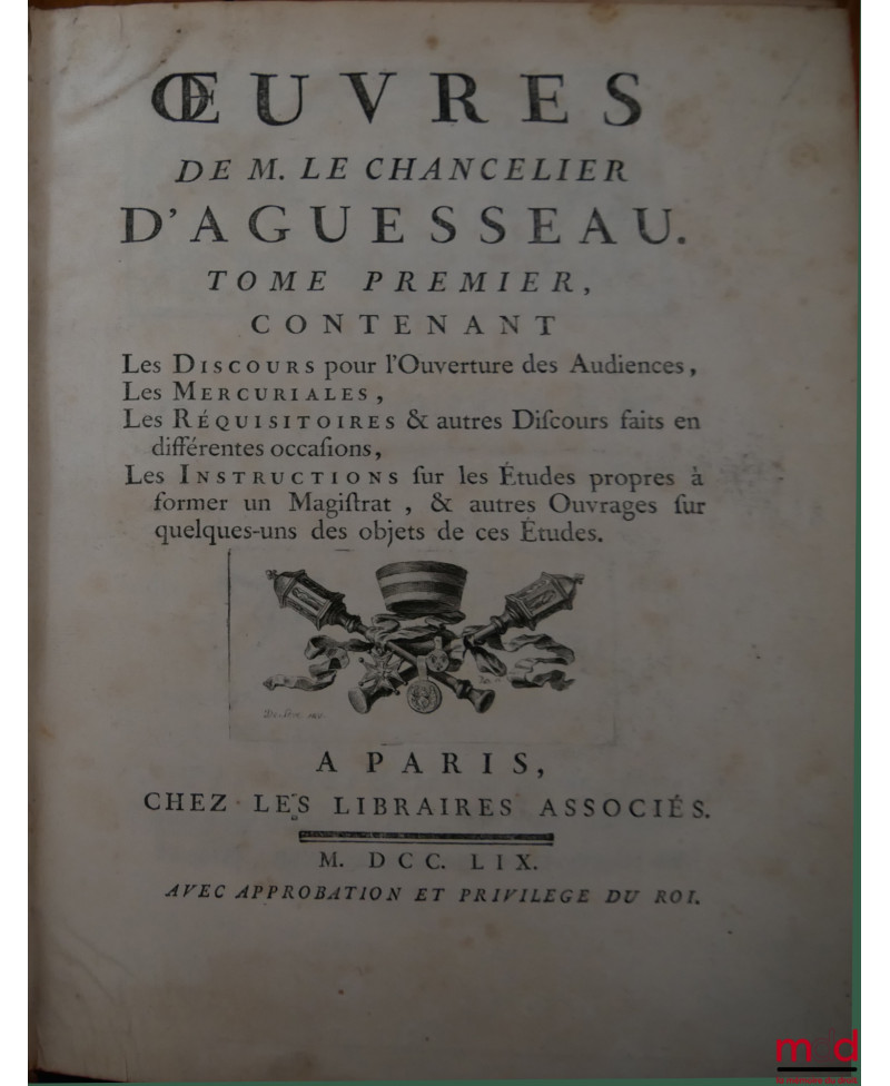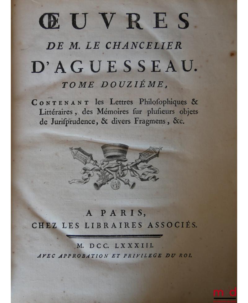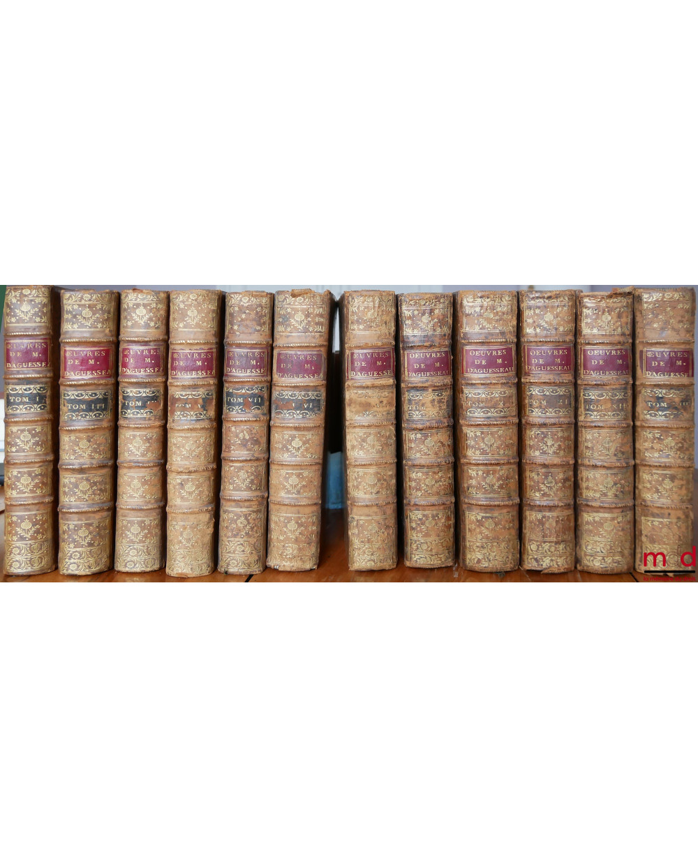 ŒUVRES DE M. LE CHANCELIER D’AGUESSEAU t. I : Les Discours pour l’ouverture des audiences, Les Mercuriales, Les Réquisitoires et autres discours faits en différentes occasions, Les Instructions sur les études propres à former un magistrat et autres ouvrages sur quelques uns des objets de ces études (1759/1761 - CXLVII-622 p.) ; t. II [manque] t. III : Les Plaidoyers prononcés au parlement en qualité d’avocat général dans les années 1694 et 1695, Deux plaidoyers l’un du mois de janvier 1696, l’autre de 1698, dans la cause de M. le Prince de Conty et Mme la Duchesse de Nemours, et un plaidoyer du mois d’avril 1696 dans la cause de M. le Duc de Luxembourg et des autres ducs et pairs (1762 - XXIV-822 p.) ; t. IV : Les Plaidoyers prononcés au parlement. ... depuis le mois d’avril 1696 et dans les années 1697, 1698 et 1699 (1764 - XXX-737 p.) ; t. V : Les Plaidoyers, mémoires, dissertations et autres ouvrages (1767 - XXXII-752 p.) ; t. VI : Plusieurs Requêtes sur les matières domaniales présentées au parlement en qualité de procureur général (1769 - XVI-773 p.) ;t. VII : Plusieurs requêtes et mémoires sur les matières domaniales avec différentes pièces sur la pairie (1772 - XLVIII-685 p.) ;t. VIII et IX : Les lettres sur les matières criminelles et civiles (1774 / 1776 - XXIV-711 / XX-731 p.) ;t. X : Suite des lettres sur les matières civiles et criminelles, considérations sur les monnaies, mémoire sur les actions de la Compagnie des Indes, etc. (1777 - XVI-460-XII-316 p.) ;t. XI : Les Méditations philosophiques sur l’origine de la justice, etc. (1779 - XVI-677 p.) ; t. XII : Les lettres philosophiques et littéraires, des mémoires sur plusieurs objets de jurisprudence et divers fragments, etc. (1784 - XXVIII-648-XLIX p.) ;t. XIII : Lettres inédites du Chancelier d’Aguesseau publiées sous les auspices de son Excellence Mgr le Comte de Peyronnet, Garde des Sceaux de France, Ministre Secrétaire d’État au département de la Justice, par D. B. Rives, Directeur des Affaires criminelles et des Grâces au département de la justice (1823 - CXVI p.-3 ff.-583 p.)