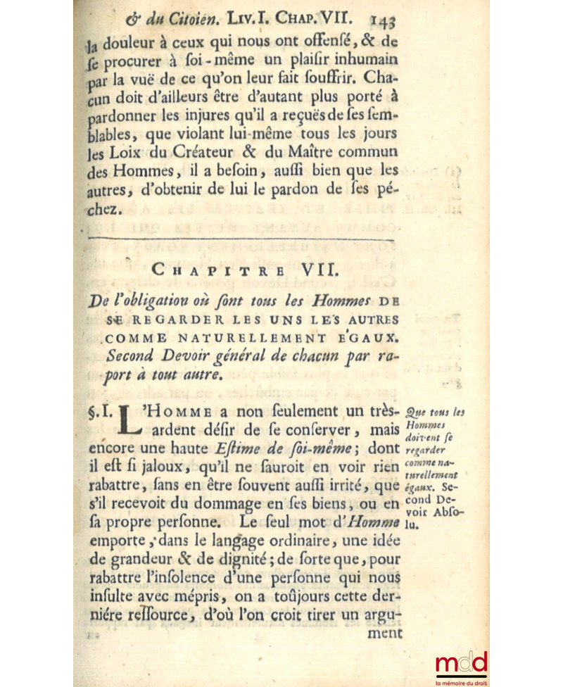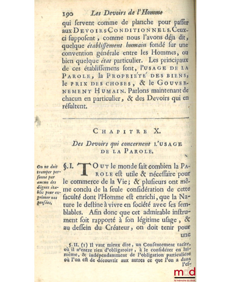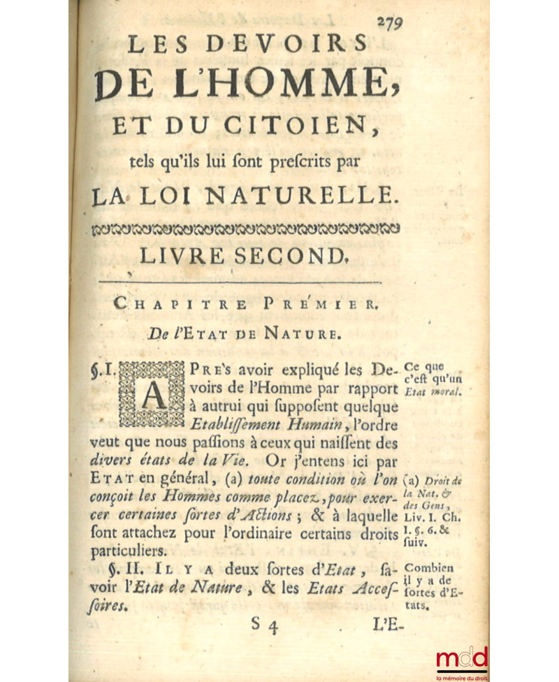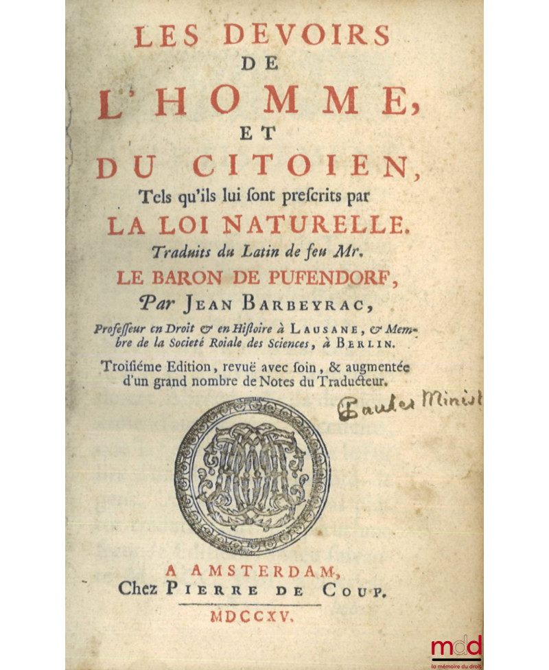 LES DEVOIRS DE L’HOMME ET DU CITOYEN, TELS QU’ILS LUI SONT PRESCRITS PAR LA LOI NATURELLE, Traduits du latin de feu Mr. Le Baron de Pufendorf par J. Barbeyrac, 3e éd., revue avec soin, & augmentée d’un grand nombre de Notes du traducteur