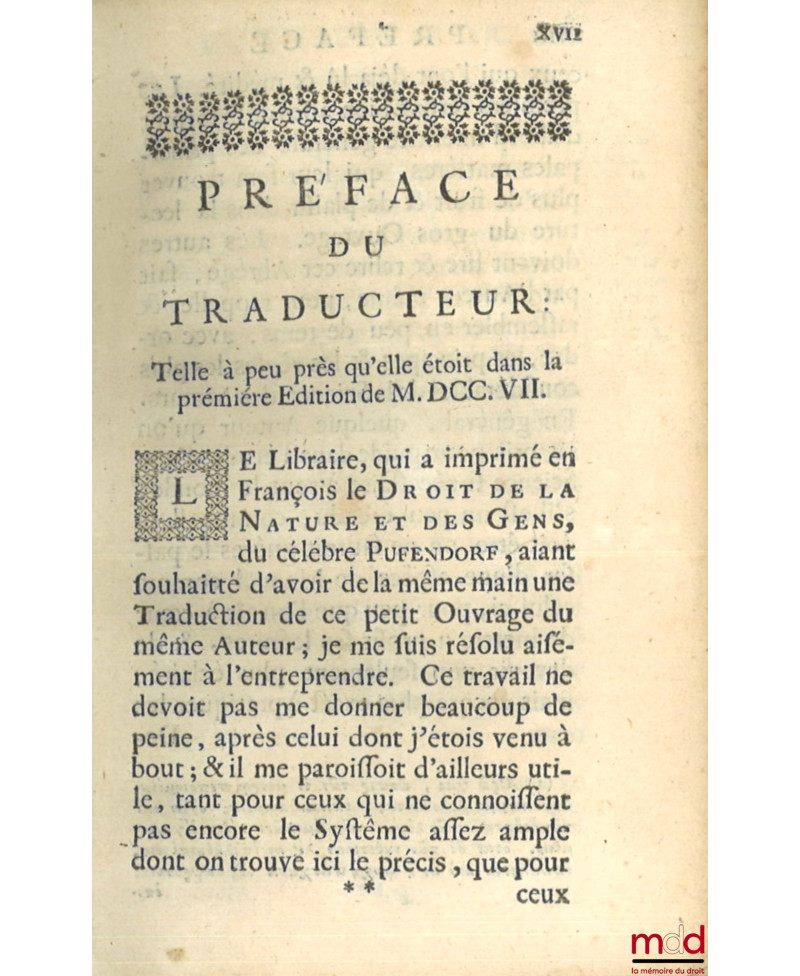 On sait que ce texte, abrégé du droit de la nature et des gens, doit beaucoup à son traducteur J. Barbeyrac. Il est d’ailleurs augmenté de bon nombre de textes qui ne figurent pas dans les éditions de l’ouvrage complet et donnent à celui-ci une portée sensiblement différente.
