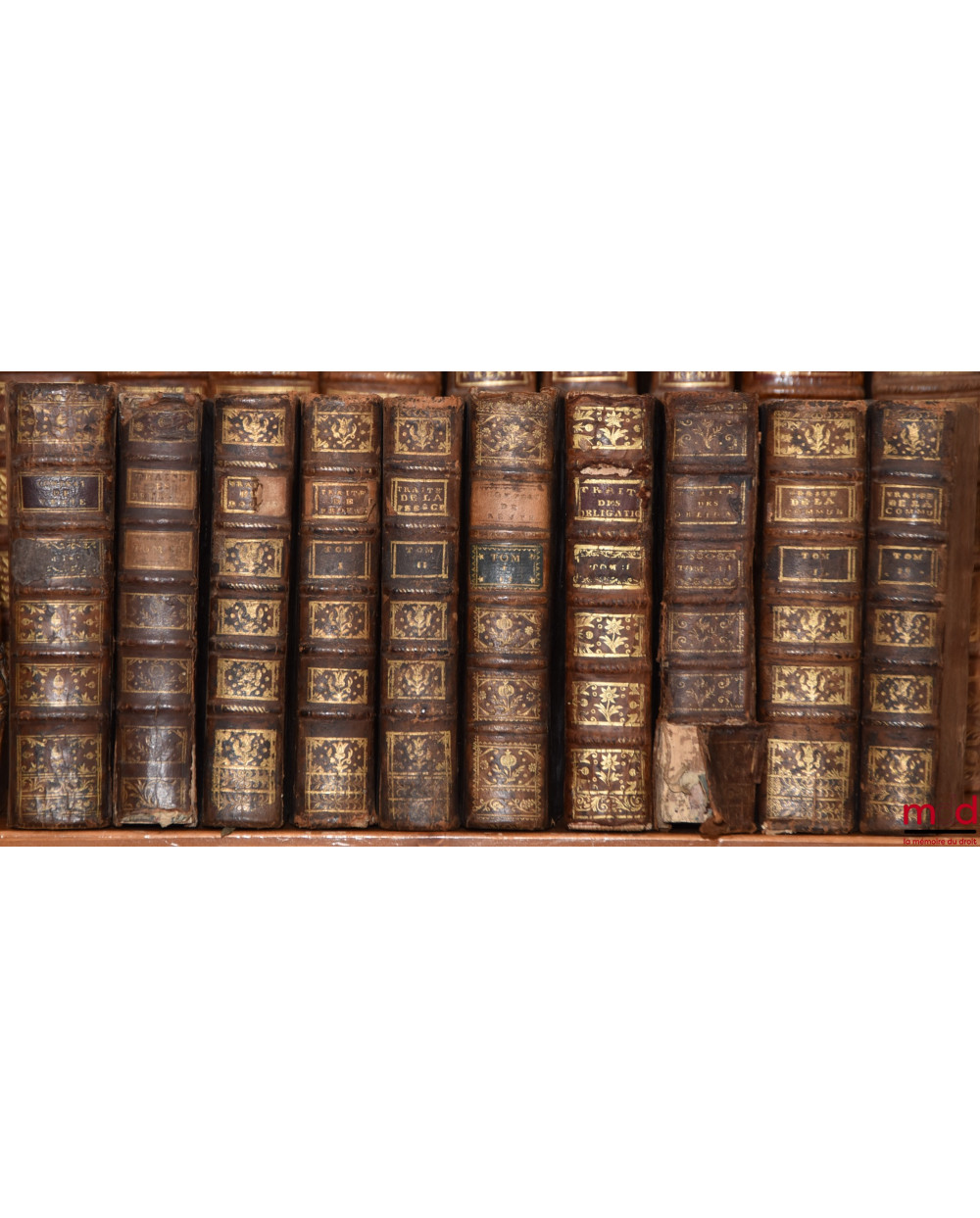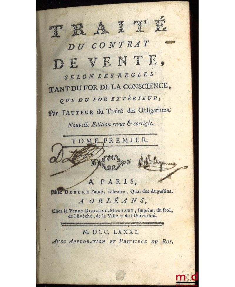 - TRAITÉ DU CONTRAT DE VENTE, […], nouvelle éd. revue & corrigée, Paris / Orléans, Debure l’aîné / J. Rouzeau-Montaut 1781, 3 t. en 2 vol. ;- TRAITÉ DU DOUAIRE […], Paris / Orléans, Debure / Vve Rouzeau-Montaut 1770 ;- TRAITÉ DU DROIT DE DOMAINE DE PROPRIÉTÉ ET TRAITÉ DE LA POSSESSION ET DE LA PRESCRIPTION, Paris / Orléans, Debure / Vve Rouzeau-Montaut 1776-1777, 2 vol. ;- TRAITÉ DU CONTRAT DE CONSTITUTION DE RENTE […] ET TRAITÉ DU CONTRAT DE CHANGE, DE LA NÉGOCIATION qui se fait par la Lettre de Change ; des Billets de Change, & autres Billets de Commerce, Paris - Orléans, Debure-Rouzeau-Montaut 1773, 2 t. en 1 vol. ;- TRAITÉ DES OBLIGATIONS, […], nouvelle éd. revue, corrigée, & considérablement augmentée par l’auteur, Paris / Orléans, Debure l’aîné / J. Rouzeau-Montaut 1770, 2 vol. ;- TRAITÉ DE LA COMMUNAUTÉ auquel on a joint un TRAITÉ DE LA PUISSANCE DU MARI sur la personne et les biens de la Femme (t. I) auquel on a ajouté une Observation sur le Contrat de Nantissement […] (t. II), Paris / Orléans, Frères Debure /Vve Rouzeau-Montaut 1774, 2 vol. ;- TRAITÉ DU CONTRAT DE LOUAGE, […], nouvelle éd. très exactement corrigée. TRAITÉ DU CONTRAT DE BAIL À RENTE, Paris / Orléans, Debure père / veuve Rouzaud-Montaut 1771, 2 t. en 1 vol. ;ŒUVRES POSTHUMES,- TRAITÉS DES FIEFS, CENSIVES, RELEVOISONS ET CHAMPARTS, Paris, Debure l’aîné 1776, 2 vol. ; - TRAITÉS DES CONTRATS DE BIENFAISANCE […], Paris / Orléans, Débure / J. Rouzeau-Montaut 1766-1767, 2 vol. ;- TRAITÉ DES CONTRATS ALÉATOIRES […], nouvelle éd., Paris / Orléans, Debure père / Vve Rouzeau-Montaut 1770 ;- TRAITÉ DE LA PROCÉDURE CIVILE ET LE TRAITÉ DE LA PROCÉDURE CRIMINELLE, Orléans / Paris, Jul. Debure aîné, 1786, t. II (uniquement) ;- TRAITÉ DU CONTRAT DE MARIAGE par l’auteur du Traité des Obligations, Paris / Orléans, Vve Rouzeau-Montaut / Debure père 1772, 2 vol.