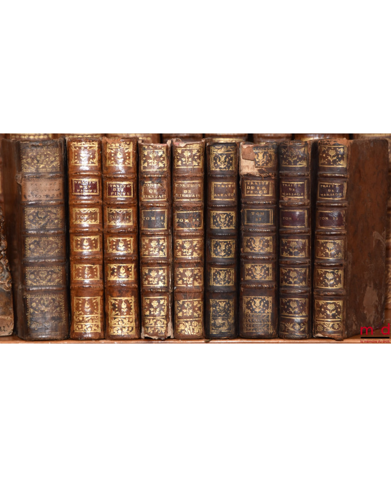 Description : 19 vol. in-12, plein veau raciné fauve d’époque, tit. & tom. sur pc. bordeaux, fauve et vertes, dos à 5 nerfs avec caissons ornés de fleurons et filets encadrant dorés, chants de plats ornés de filets dorés, tr. rouges, bandeaux et lettrines, (certaines coiffes accidentées dont deux en partie désolidarisées, qq. mq. de cuir en pc. de tit., coupes et coins émoussés, plats frottés et avec épidermures, trous de vers en couv. et en marge de certains traités, très rares piqûres et qq. mouillures claires en marge, les 2 vol. du Traité du mariage présentant une mouillure légèrement plus sombre et touchant le texte sur la partie inf. cependant), globalement en moyen état.