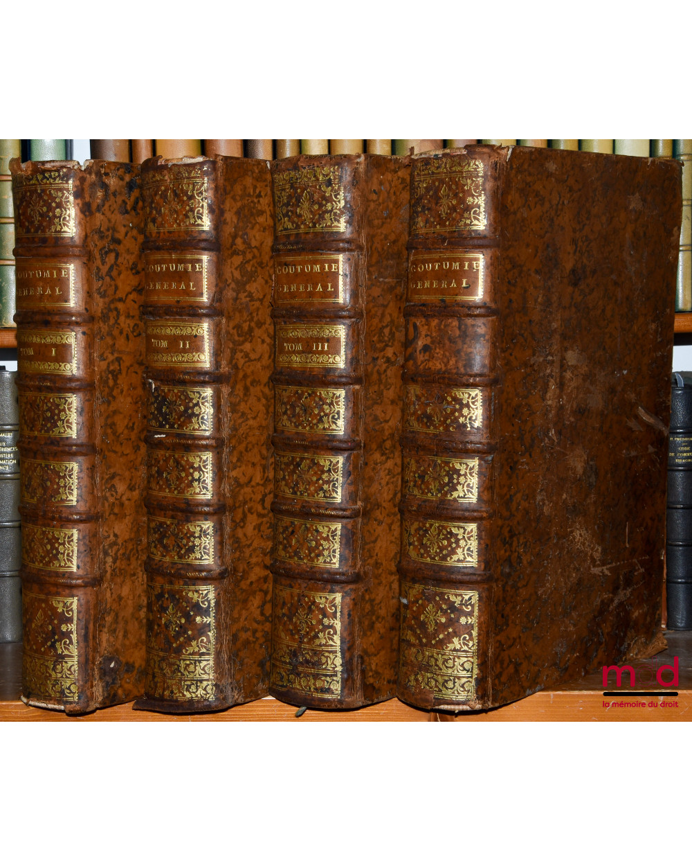 Les ouvrages de compilation de coutumes sont apparus en France dès le XVe siècle, et l’on peut considérer la « Somme Rural » de Boutillier, comme le premier d’entre eux. Une deuxième vague apparut au XVIIe siècle, sous l’impulsion notamment d’Eusèbe de Laurière (Bibliothèque des coutumes). Mais le texte de Bourdot de Richebourg (1665-1735) a constitué la synthèse définitive sur cette question : publié en 1724, il ne connaîtra aucun successeur jusqu’à la fin de l’ancien régime. Il faut dire qu’au texte des coutumes il joint les commentaires les plus importants (Dumoulin, Brodeau, Rageau et Laurière…), constituant ainsi une documentation unique et maniable sur la question. Les auteurs modernes soulignent l’importance qu’il a conservée : « toute étude des sources coutumières pour l’époque moderne nécessite le recours à Bourdot de Richebourg » (Sueur, T. II, p. 152). Bibliographie : Les éditions sont parfois reliées en 8 vol. mais le plus souvent, comme la nôtre, en 4 ; Dupin, n° 1180. Bibliothèques : BNF FR33332763 ; Berkeley, Robbins Rare KJV260.3 1724 Folio ; Harvard, Law School, Rare Coutumes ALK6535/bks).