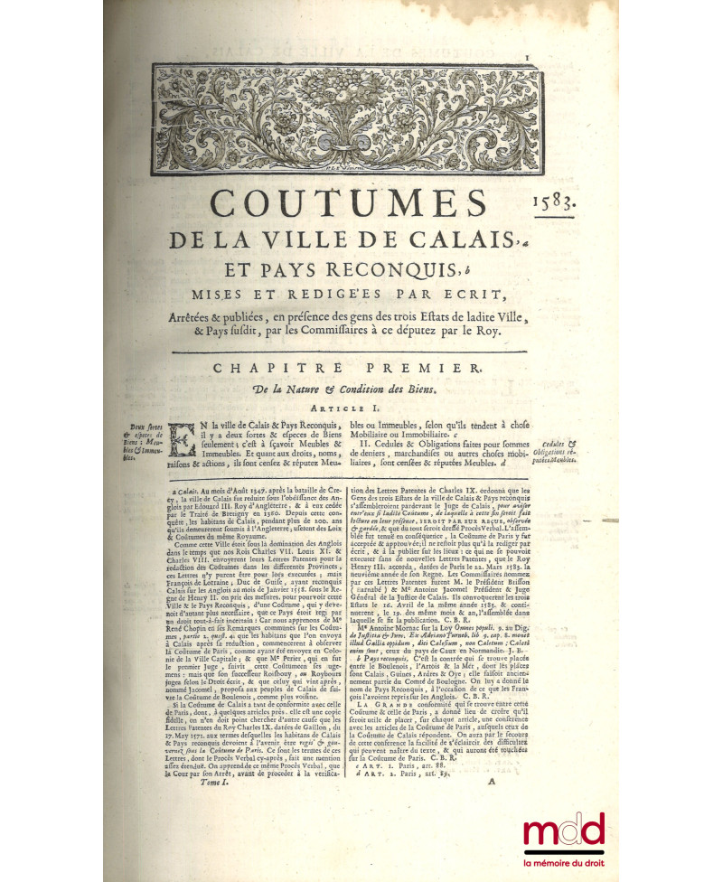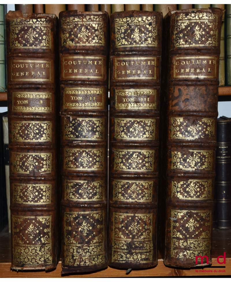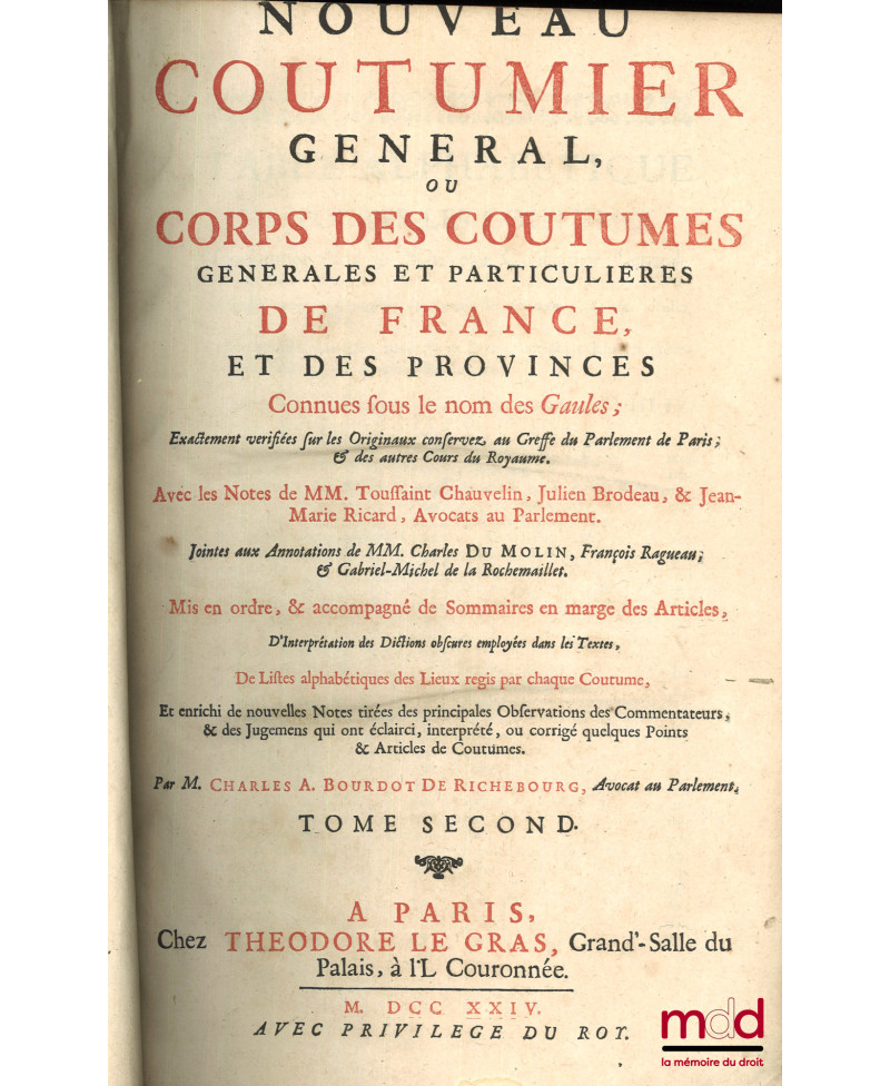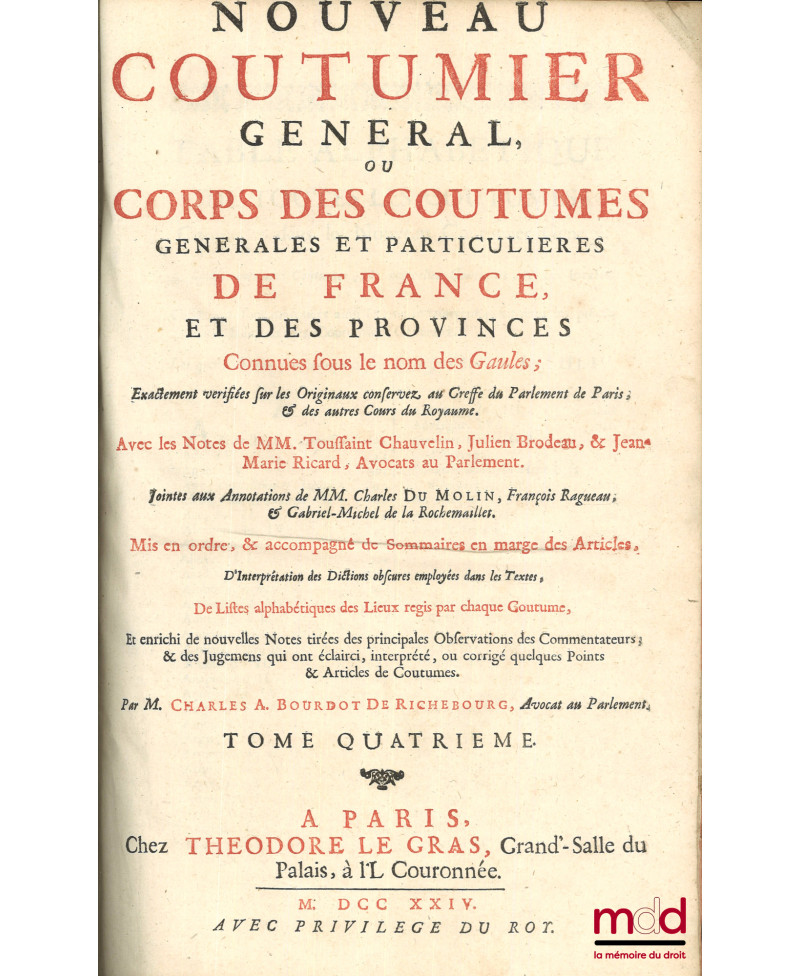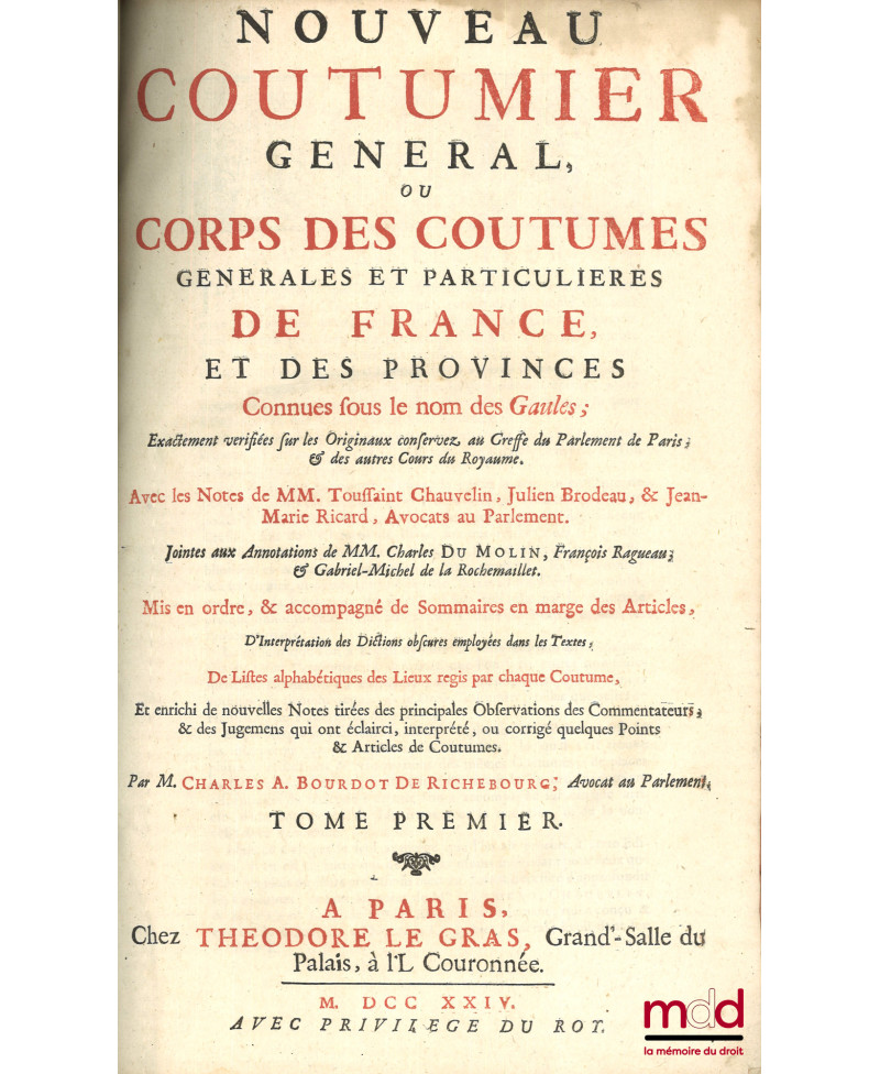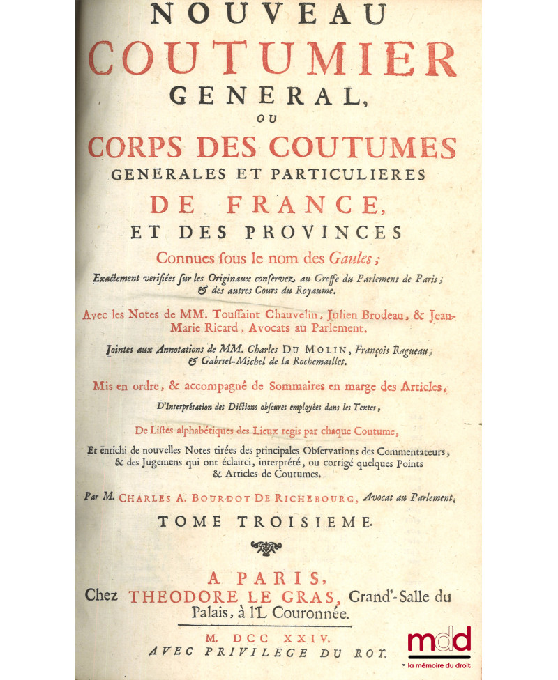 NOUVEAU COUTUMIER GÉNÉRAL OU CORPS DES COUTUMES GÉNÉRALES ET PARTICULIÈRES DE FRANCE, ET DES PROVINCES CONNUES SOUS LE NOM DES GAULES ; exactement vérifiées sur les Originaux conservez au Greffe du Parlement de Paris, & des autres Cours du Royaume. Avec les notes de MM. Toussaint Chauvelin, Julien Brodeau, & Jean-Marie Ricard […] jointes aux Annotations de MM. Charles du Molin, François Rageau, & Gabriel-Michel de la Rochemaillet. Mis en ordre, & accompagné de Sommaires en marge des Articles, d’Interprétation des Dictions obscures employées dans les Textes, de Listes alphabétiques des Lieux régis par chaque Coutume, et enrichi de nouvelles Notes tirées des principales Observations des Commentateurs, & des Jugemens qui ont éclairci, interprété, ou corrigé quelques Points & Articles de Coutumes, par M. Charles A. Bourdot de Richebourg