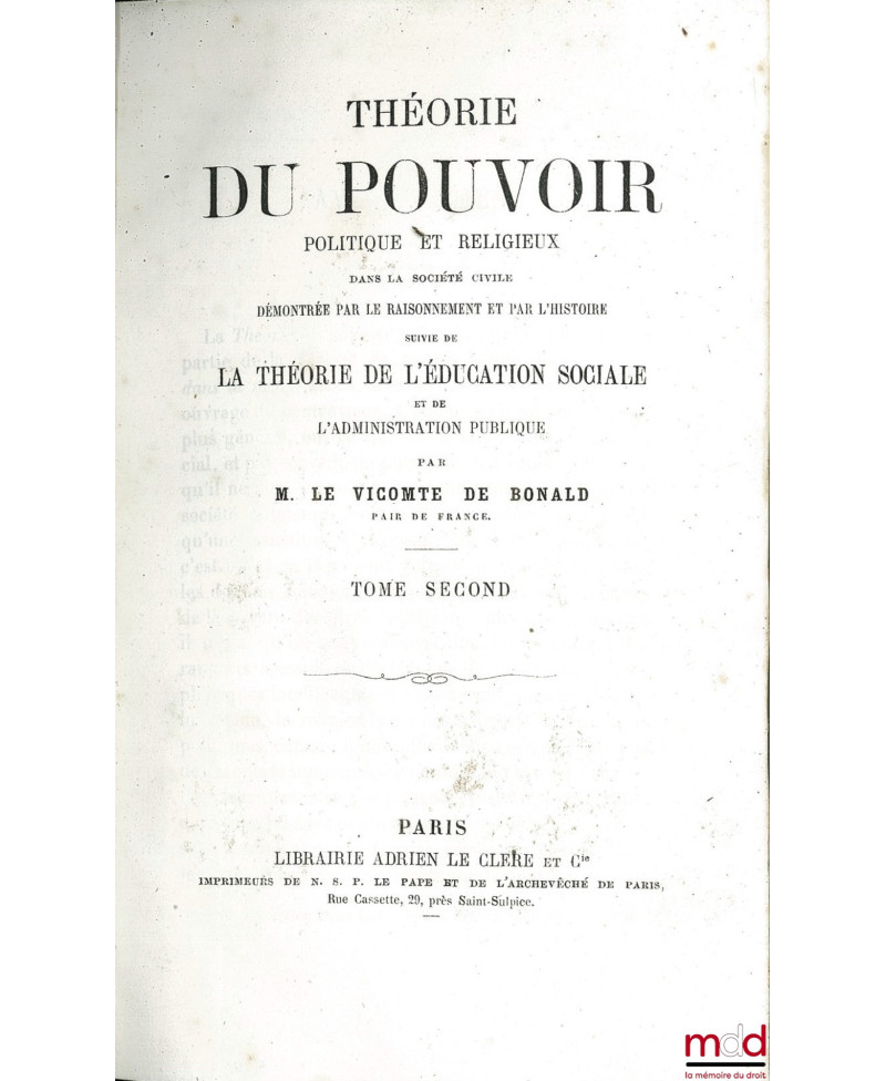 THÉORIE DU POUVOIR POLITIQUE ET RELIGIEUX DANS LA SOCIÉTÉ CIVILE DÉMONTRÉE PAR LE RAISONNEMENT ET PAR L’HISTOIRE SUIVIE DE LA THÉORIE DE L’ÉDUCATION SOCIALE ET DE L’ADMINISTRATION PUBLIQUE, t. second