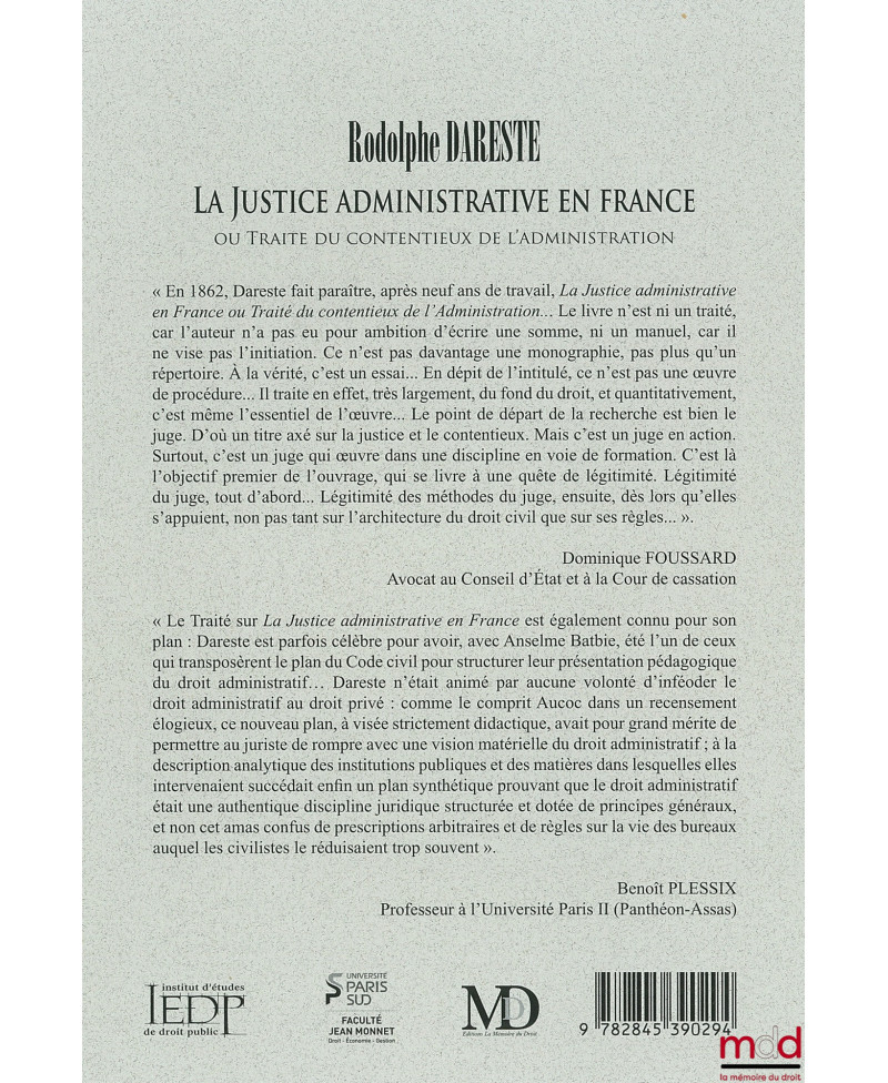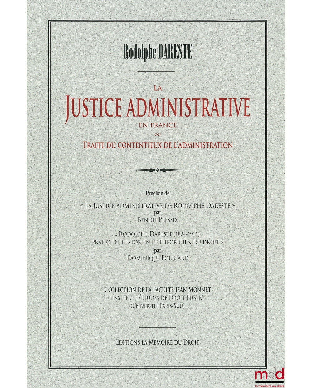 LA JUSTICE ADMINISTRATIVE EN FRANCE OU TRAITÉ DU CONTENTIEUX DE L’ADMINISTRATION Réimpression de la 1re éd. de 1862 chez Larose & Forcel Présentation par Benoît PLESSIX, « La Justice administrative de Rodolphe Dareste », Avant-propos par Dominique FOUSSARD, « Rodolphe Dareste (1824-1911) Praticien, Historien et Théoricien du droit », Coll. de la Faculté Jean Monnet