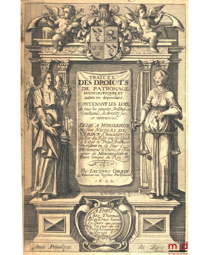 TRAICTÉ DES DROICTS DE PATRONAGE HONORIFIQUES ET AUTRES EN DEPENDANS. CONTENANT LES LOIX DE TOUS LES PEUPLES, ORDONNANCES, COUSTUMES, ET ARRESTS SUR CE INTERVENUS, dédié à Nicolas de Verdun (…)