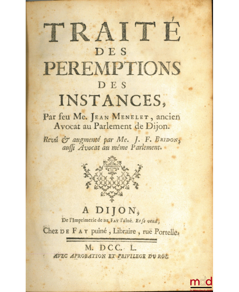 TRAITÉ DES PÉREMPTIONS DES INSTANCES, Revû & augmenté par Me. J. F. Bridon