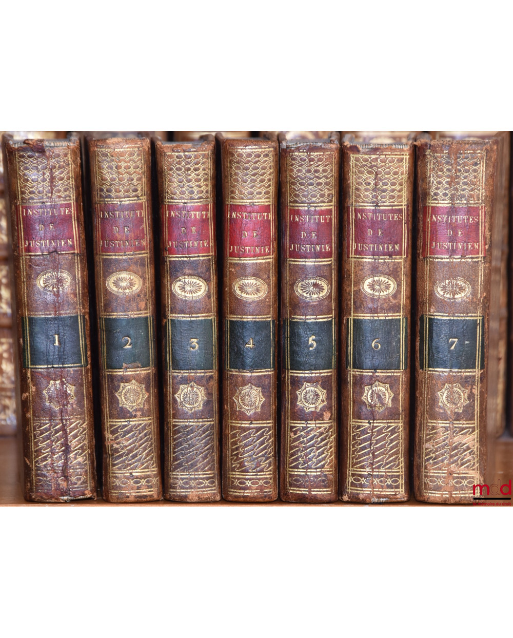 Description : 7 vol. petit in-8, plein veau brun raciné, tit. & tom dorés sur pc. grenat et vertes, dos lisses ornés de dentelles et fers dorés encadrés de doubles filets, tr. jaunes, (dos lég. frottés, coiffes affaissées avec qq. petits accidents, dos fendus aux t. I et VI, qq. trous de vers non traversants, qq. rousseurs).