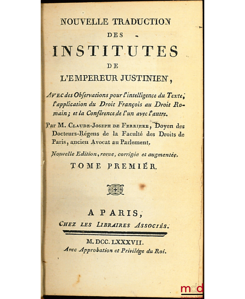 NOUVELLE TRADUCTION DES INSTITUTES DE L’EMPEREUR JUSTINIEN, Avec des Observations pour l’intelligence du Texte, l’application du Droit François au Droit Romain ; et la Conférence de l’un avec l’auteur, Nouvelle éd. revue, corrigée et augmentée