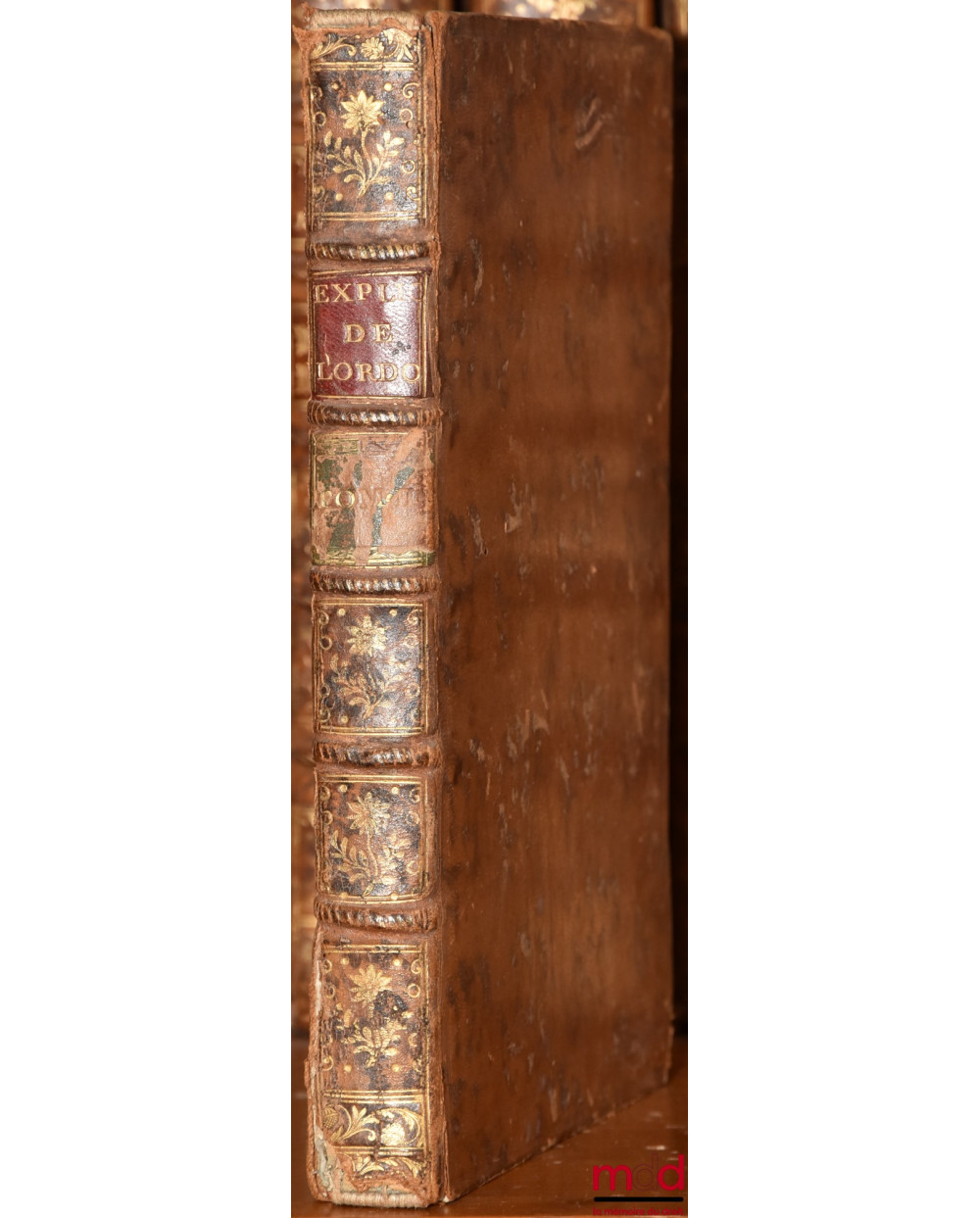 Description : in-4, plein veau fauve, tit. doré sur pc. bordeaux, dos à 5 nerfs orné de fleurons et doubles filets encadrants dorés, roulettes soulignant les nerfs, tr. jaspées, (mors fendus aux extrémités, coiffes accidentées avec de forts mq., coins émoussés avec des mq., rares rousseurs), XII-264 p.
