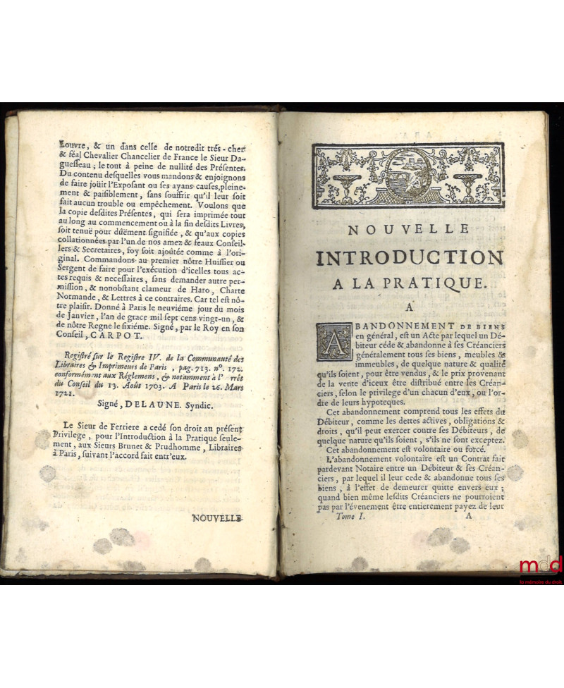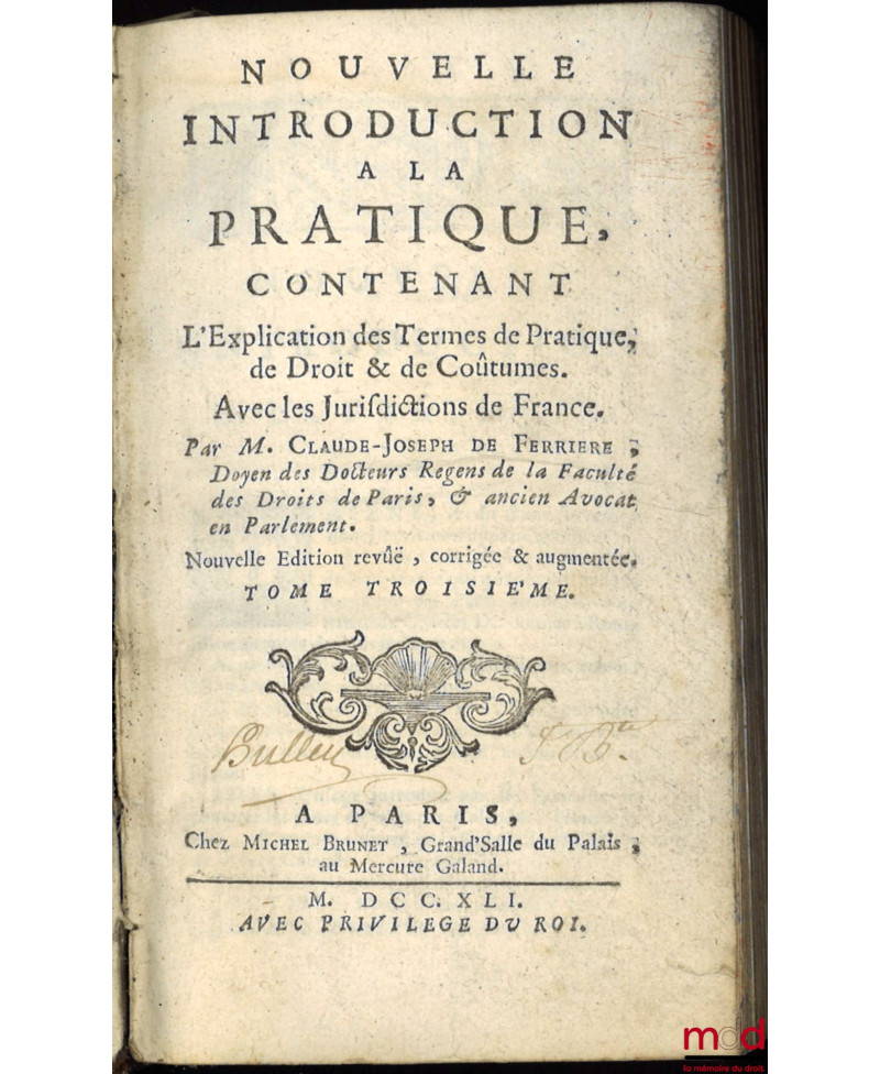 NOUVELLE INTRODUCTION À LA PRATIQUE, contenant l’Explication des principaux Termes de Pratique, de Droit et de Coutume avec les Jurisdictions de France, seconde éd. revue, corrigée et augmentée