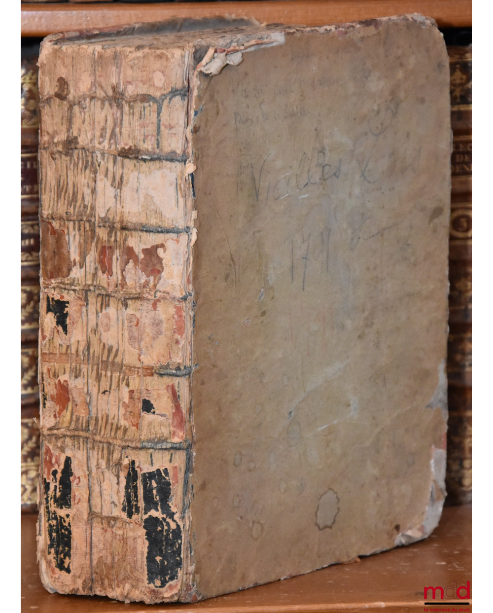 - fort in-4, rel. d’attente, nerfs apparents, plats cartonnés et couverts de parchemin, (rel. de dos manquante, coupes frottées, coins avec mq. et émoussés, qq. taches sur le premier plat, plusieurs acidifications du papier, des rousseurs et qq. piqûres, le tout restant très lisible), épaisseur : 7 cm.