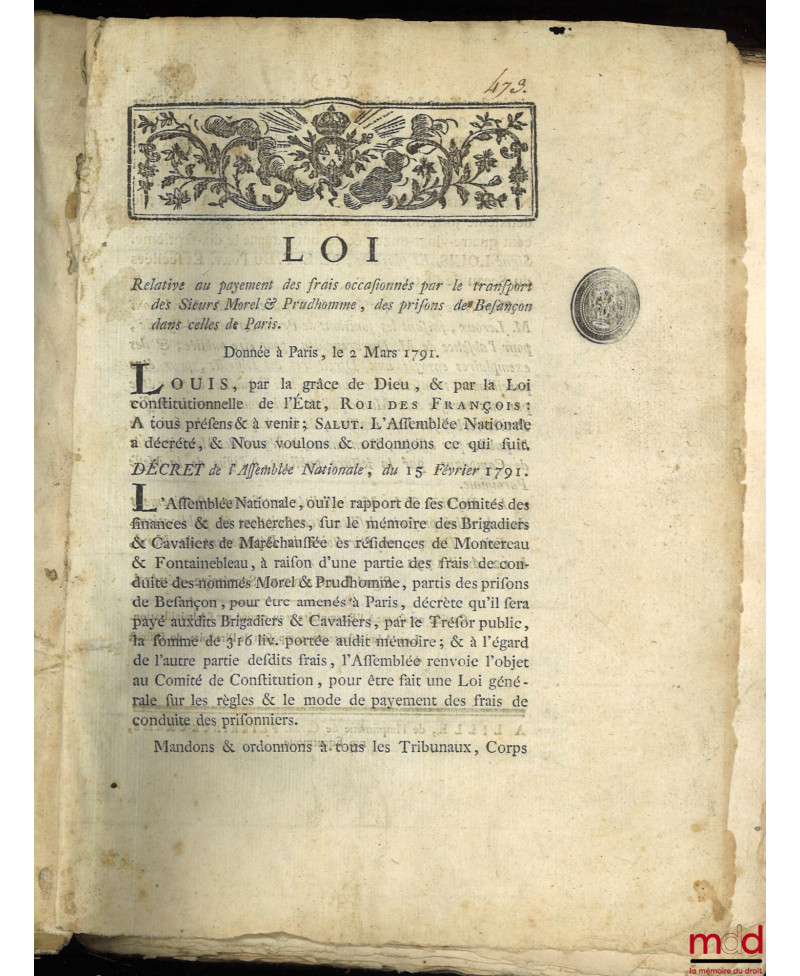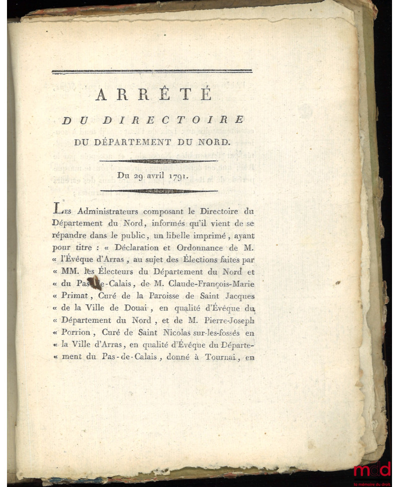 RECUEIL DE LOIS, PROCLAMATIONS DU ROI ET DE LA LETTRE PASTORALE DE MONSIEUR L’ÉVÊQUE DU DÉPARTEMENT DU NORD D 2 MARS AU 27 AVRIL 1791