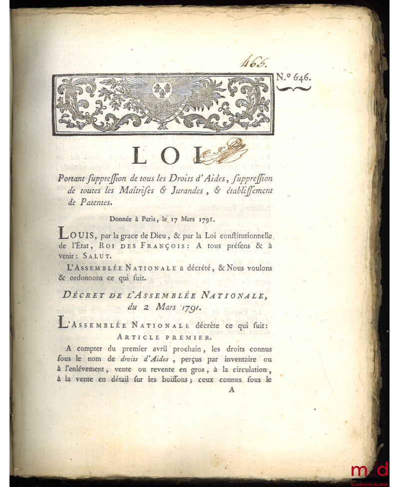 Le présent recueil, dans sa reliure d’attente, contient des textes révolutionnaires, principalement des lois prises après décret de l’Assemblée nationale en mars et avril 1791. Des notes manuscrites du relieur figurent sur le premier plat pour nous donner des indications sur l’apparence physique que l’ouvrage était sensé revêtir : sous le titre de « Vieilles lois 1791 etc », il devait être relié sous pleine basane jaspée marron. Le fameux Décret d’Allarde, Loi du 2-17 mars 1791, figure dans le présent recueil.