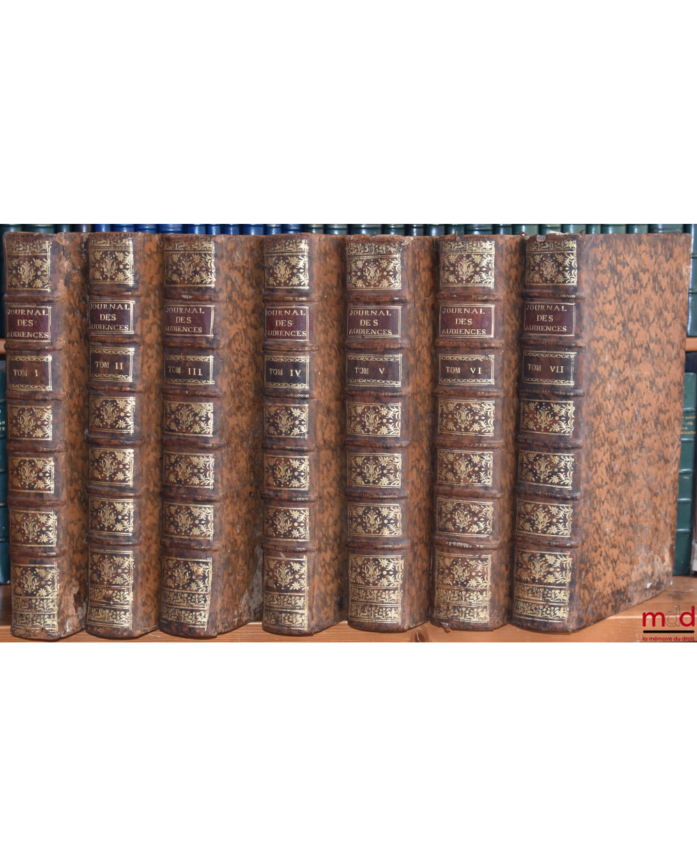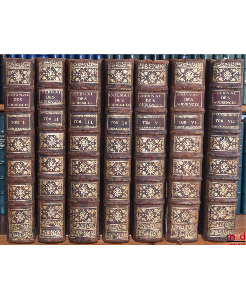 Dupin n° 1325 annonce la première édition de ce journal en 1680, alors qu’elle parut en 1646 (v. BNF F1266) nous présentons ici un exemplaire tiré de la dernière édition des cinq premiers tomes et de la première (et unique) pour les deux derniers. « Initialement placée sous le patronage du président Mathieu Molé (une dédicace en latin lui est adressée), la collection est l’œuvre d’une succession d’avocats du Parlement de Paris. Acceptant de vaincre sa modestie à la demande de certains de ses amis (l’imprimeur au lecteur, T. III, 1652), J. Du Fresne, seigneur de Preaulx, publie, en 1646 (D.B.F., notice « Du Fresne »), un premier tome qui reçoit un accueil favorable. C’est qu’il s’agit là du premier recueil d’arrêts du Parlement de Paris, du moins en français ; car deux recueils latins avaient précédemment paru, l’un en 1559 (Poenis Lucii placita summae apud Gallos Curiae, Lutetiae), l’autre en 1604 (Annaei Roberti res judicatae) traduit, il est vrai en français en 1622 ; mais ils n’avaient ni l’ampleur ni l’ambition du Journal que lance J. Du Fresne. Celui-ci, en effet (et ses successeurs suivront la même démarche), entend non seulement rassembler une foule de décisions, mais les éclairer sur le plan des faits et des moyens, les reproduire textuellement ainsi que les plaidoiries des avocats. Fruit d’un immense travail qui explique le relatif écart entre la tranche chronologique étudiée et la date de publication du volume correspondant. Du Fresne disparu (1675), Jamet de La Guessière, qui a en sa possession les manuscrits de ce dernier (le Libraire au lecteur, T. I, 1757), poursuit la compilation, selon d’ailleurs le souhait empressé du public, avec le même souci d’exactitude et de fidélité et avec le même succès, comme en témoignent les fréquentes rééditions des premiers tomes. Ces rééditions sont soigneusement revues, corrigées (qu’il s’agisse des dates ou du contenu des arrêts), augmentées des nouveaux règlements et des questions nouvelles jugées depuis la publication antérieure. » (Robert Granderoute) L’intérêt de ce texte est d’être moins touffu qu’un recueil d’arrêts au sens strict que de donner une vue synthétique des solutions juridictionnelles. Il est clair et suivi d’un index substantiel. Très rare de l’édition de référence, complète des sept tomes, et présentée ici dans une reliure bien conservée.