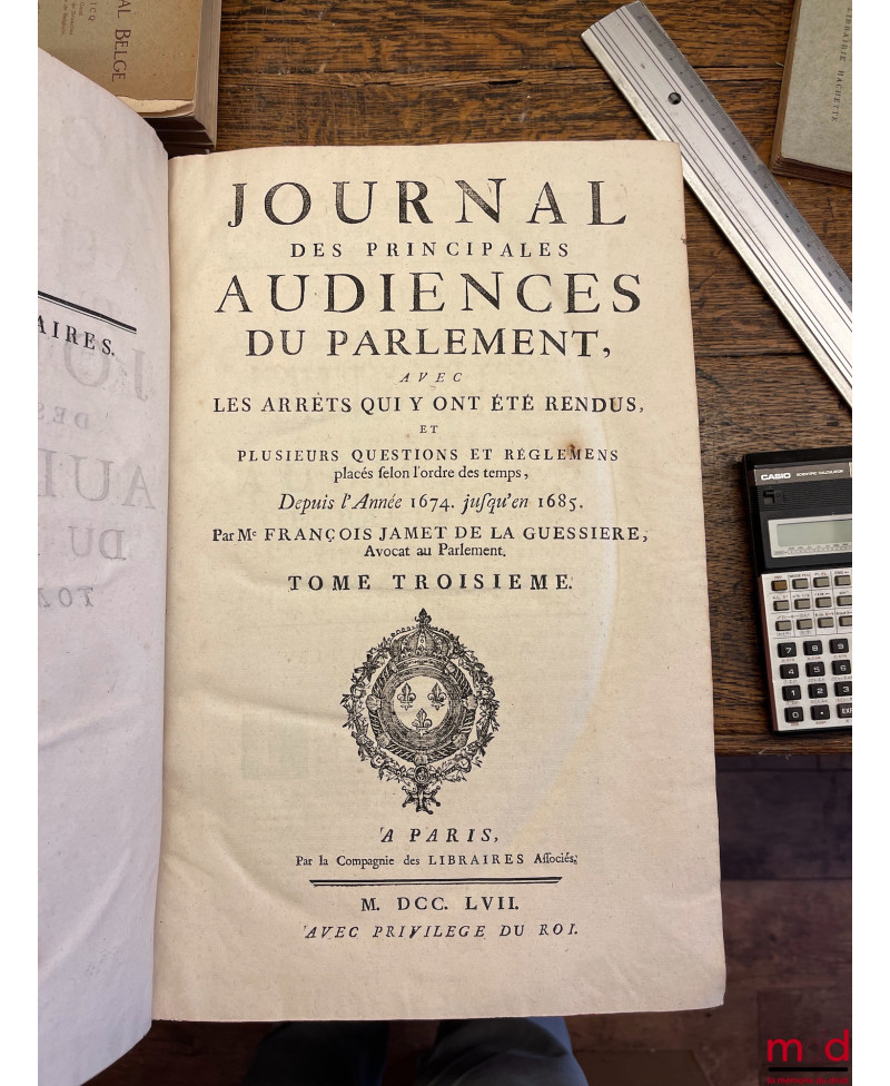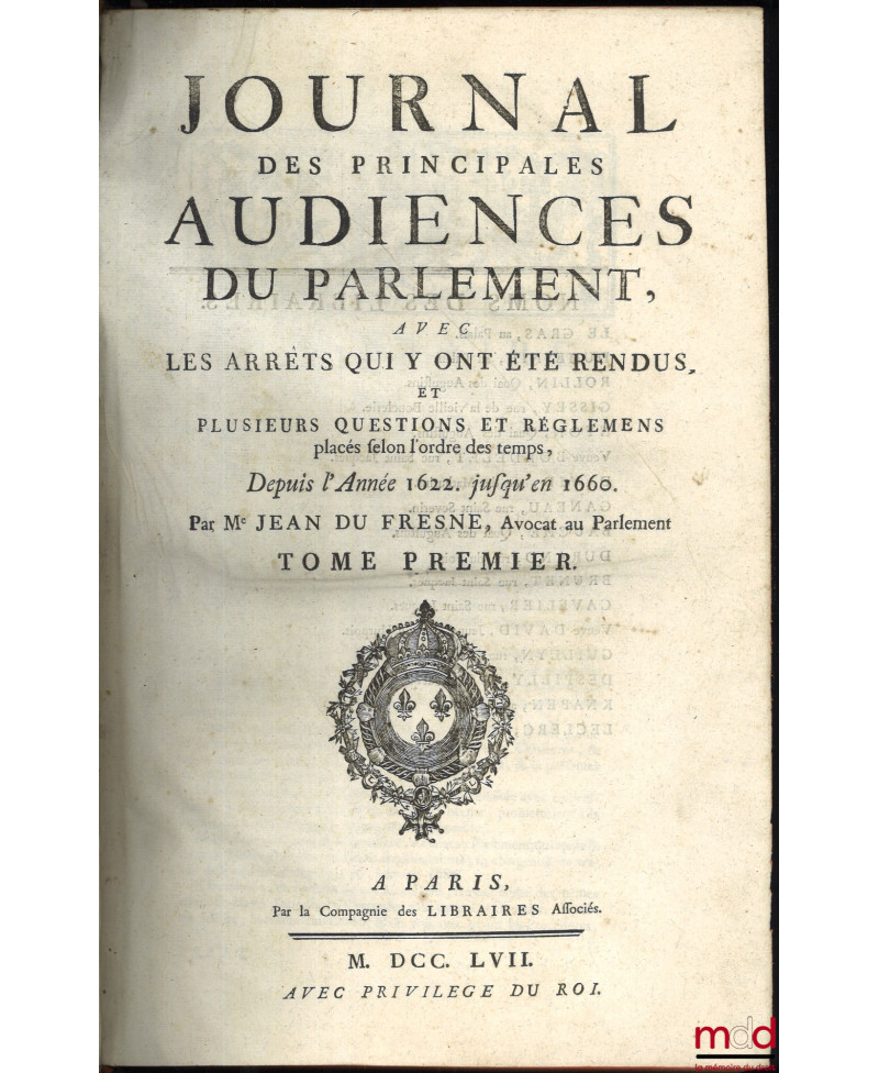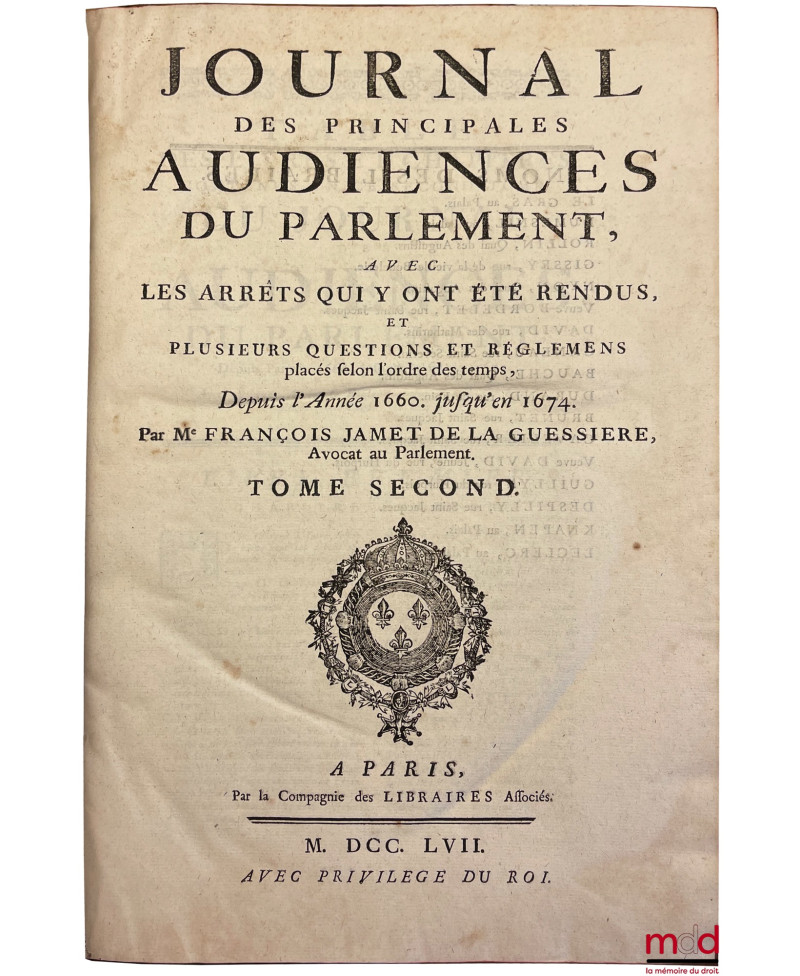JOURNAL DES PRINCIPALES AUDIENCES DU PARLEMENT, AVEC DES ARRÊTS QUI Y ONT ÉTÉ RENDUS, ET PLUSIEURS QUESTIONS ET RÉGLEMENS placés selon l’ordre du temps.T. I : Depuis l’Année 1622 jusqu’en 1660 (par Jean du Fresne, par la Compagnie des Libraires Associés, 1757) ;t. II : Depuis l’Année 1660 jusqu’en 1674 (par François Jamet de la Guessière, 1757) ;t. III : Depuis l’Année 1674 jusqu’en 1685 (par François Jamet de la Guessière, 1757) ;t. IV : Depuis l’Année 1685 jusqu’en 1701 (par Nicolas Nupied, 1757) ;t. V : Depuis l’Année 1700 jusqu’en 1710 (par Nicolas Nupied, 1757) ;t. VI : Depuis l’Année 1711 jusqu’en 1717 (par Me Michel du Chemin, chez Bordelet, 1751) ;t. VI : Depuis l’Année 1718 jusqu’en 1722 ET UN SUPPLÉMENT AU MÊME JOURNAL qui remonte jusqu’en 1623 (par Me Michel du Chemin, chez Ganeau, 1754)