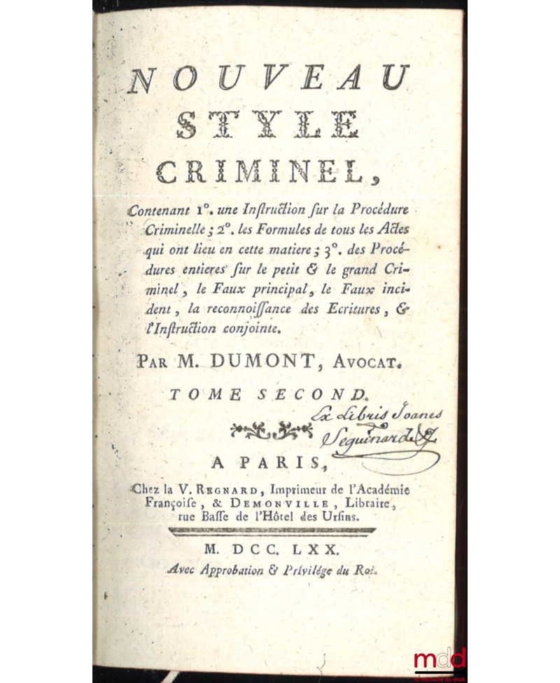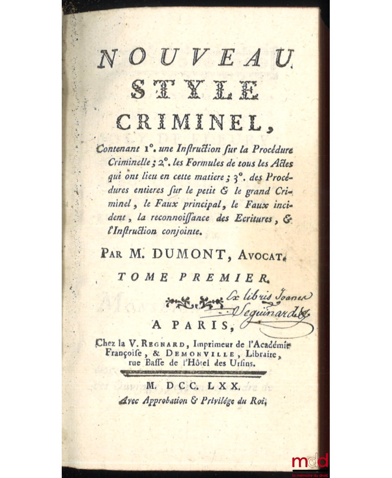 NOUVEAU STYLE CRIMINEL, Contenant 1° une instruction sur la Procédure Criminelle ; 2° les Formules de tous les Actes qui ont lieu en cette matière ; 3° des Procédures entières sur le petit & le grand Criminel, le Faux principal, le Faux incident, la reconnaissance des Écritures, & l’Instruction conjointe